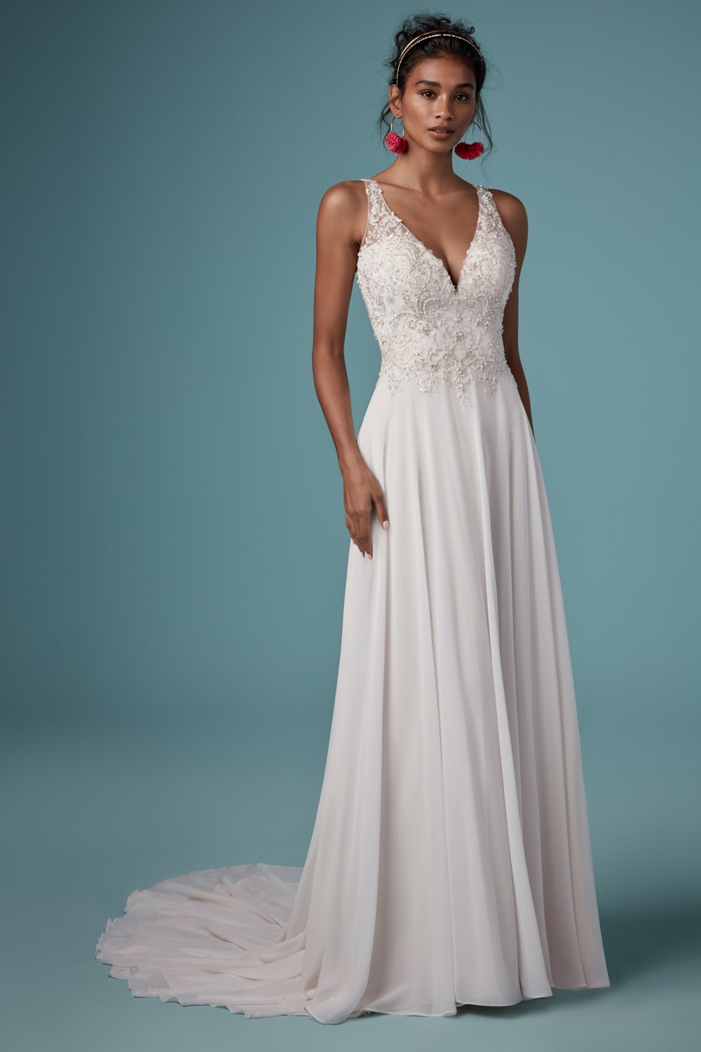 I want to tell you more. For many brides with defied hips, thin shoulders and slim waist, the typical pear-shaped body, the A line perfectly suits. Indeed everybody has a different style. For instance a mikado dress with V neckline may be a right answer for the simple bride who doesn’t love embroideries or laces. While if you want to shine up let me advice to go for a dress with a bodice fully made with embroideries and pearls and a plain and light skirt.