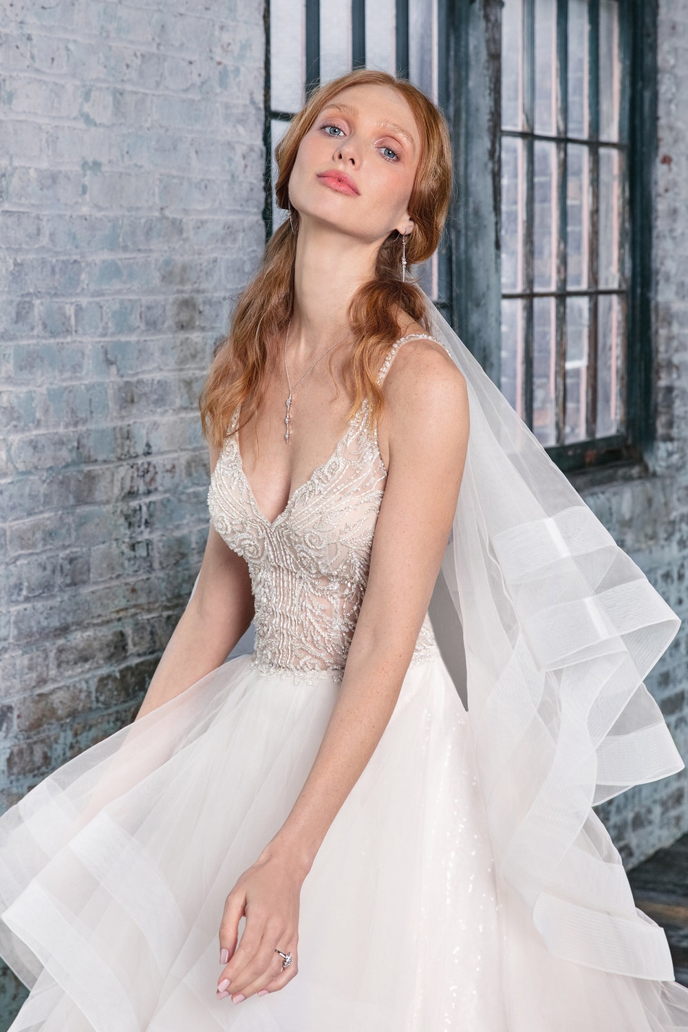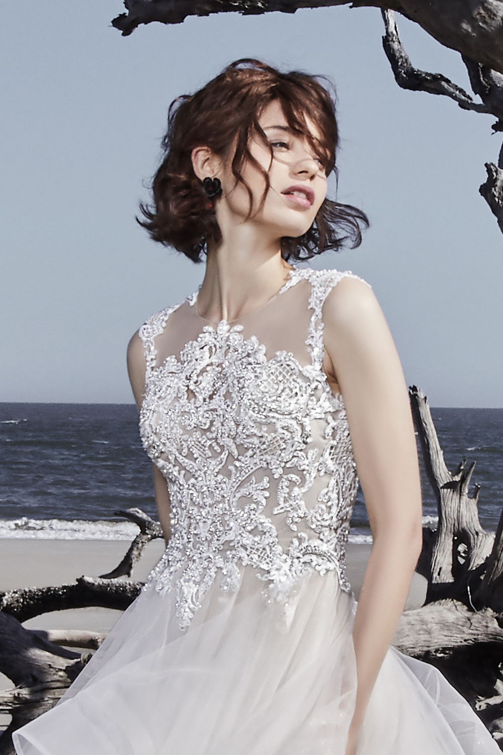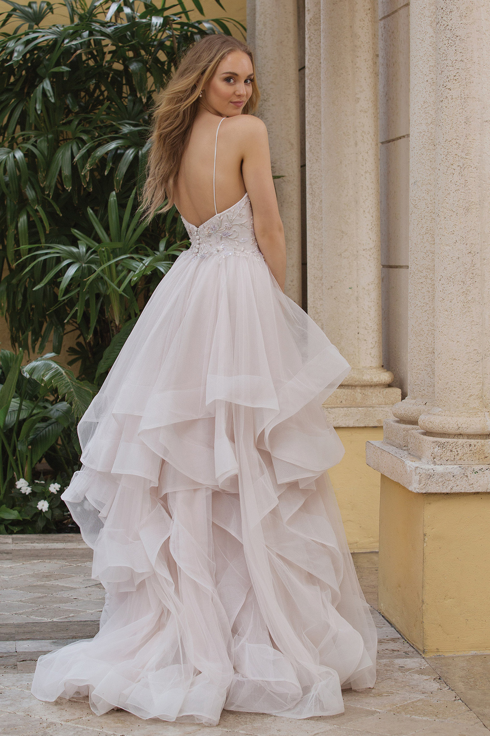 Sottero & Midgley, modello Ariya. This modern princess ballgown features a beaded lace bodice, accented in crystals, atop a tiered tulle skirt trimmed in horsehair. Beaded lace motifs complete the unique illusion jewel neckline and statement illusion back. Finished with crystal buttons and zipper closure.