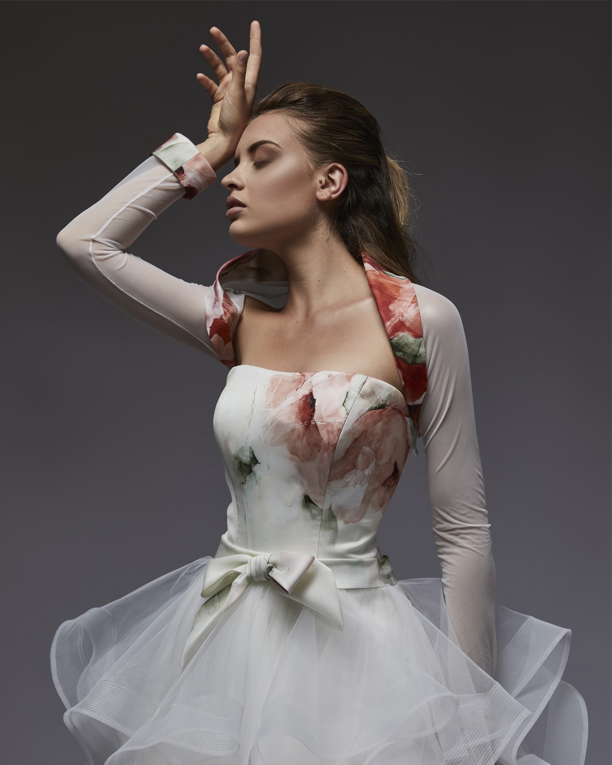 This dress has an embroidered bodice with numbers of strass and pearls and the frilled skirt in jacquard organza is design with roses that make this dress unique.