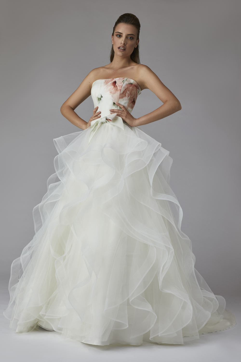 The Ruffled Wedding Dress is one of the main trends of 2019, made by tulle or organza. Usually the bodice is tiny for balancing the skirt’s width, but it could be full of details. In my in store dresses you can find different wedding grown of this type.