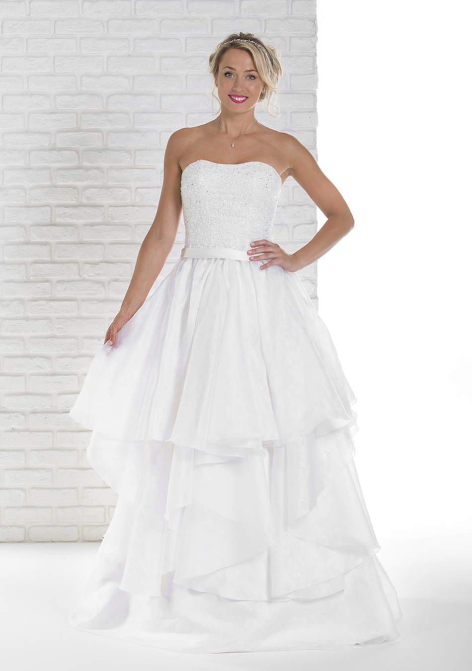 My advice: If you look like as a thin person take care of the skirt’s volume. My advice is to opt in favour of a balance wedding gown to enhance your figure. You don't have to disappeat in a cloud of fabric: