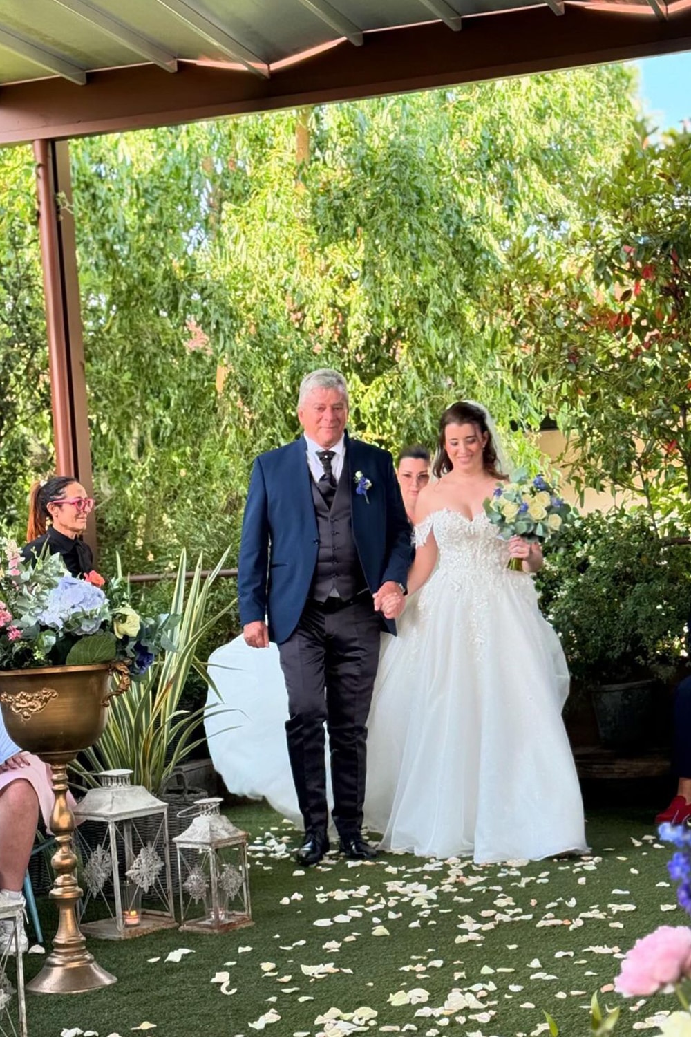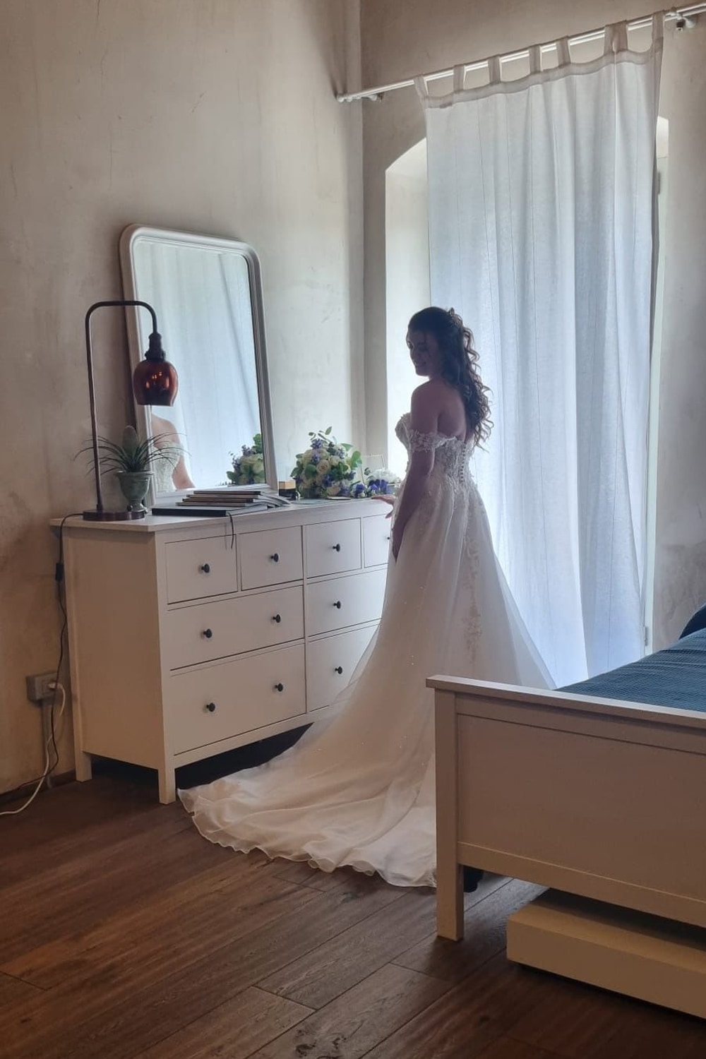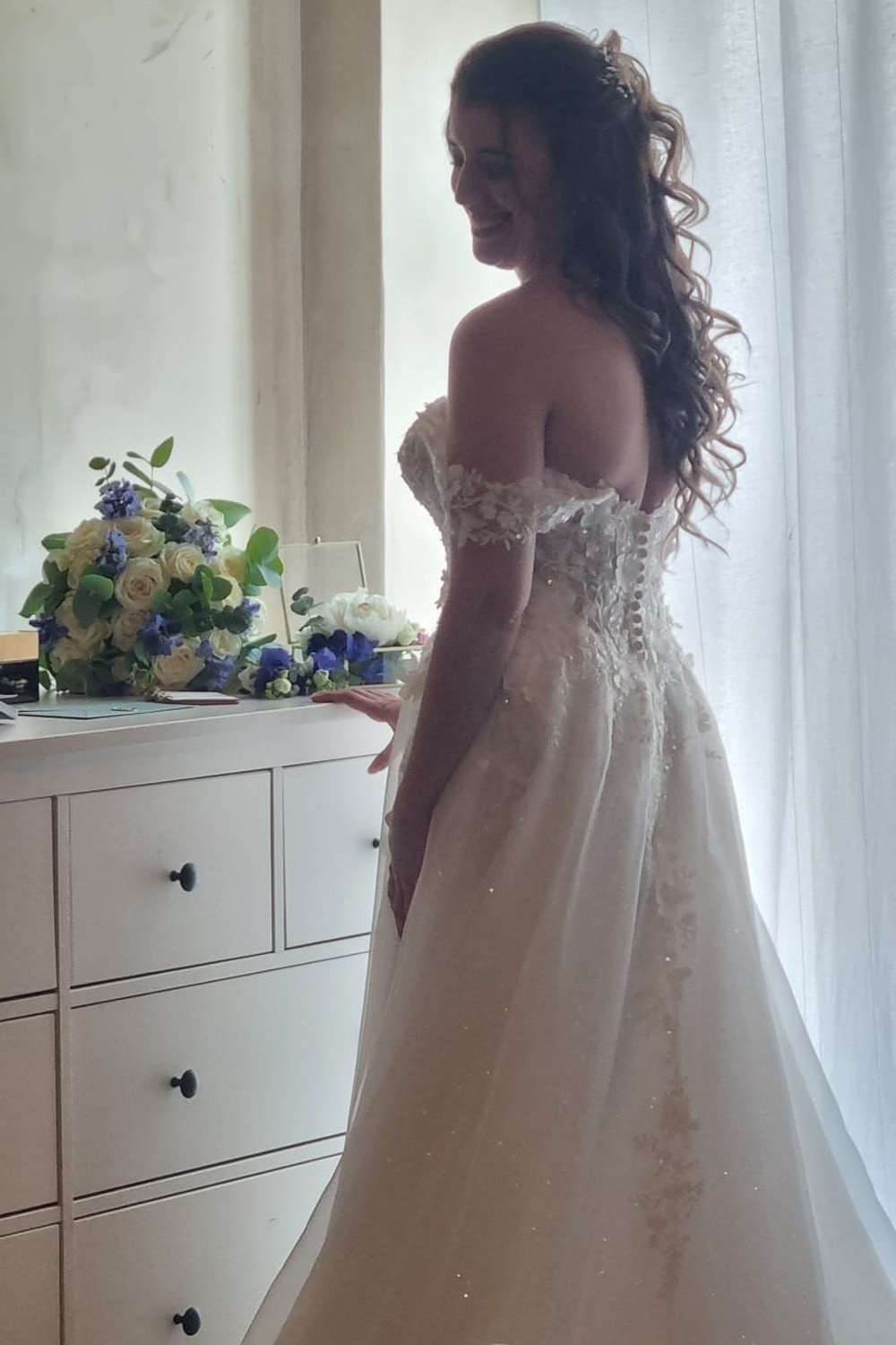 The journey together was truly wonderful. The work done on the dress was perfect, so much so that I felt completely comfortable in it throughout the entire wedding—it was incredibly comfortable! During the fittings, she gave me lots of advice that was very helpful, and I also bought both my hair accessories and shoes from her—I was happy with everything!