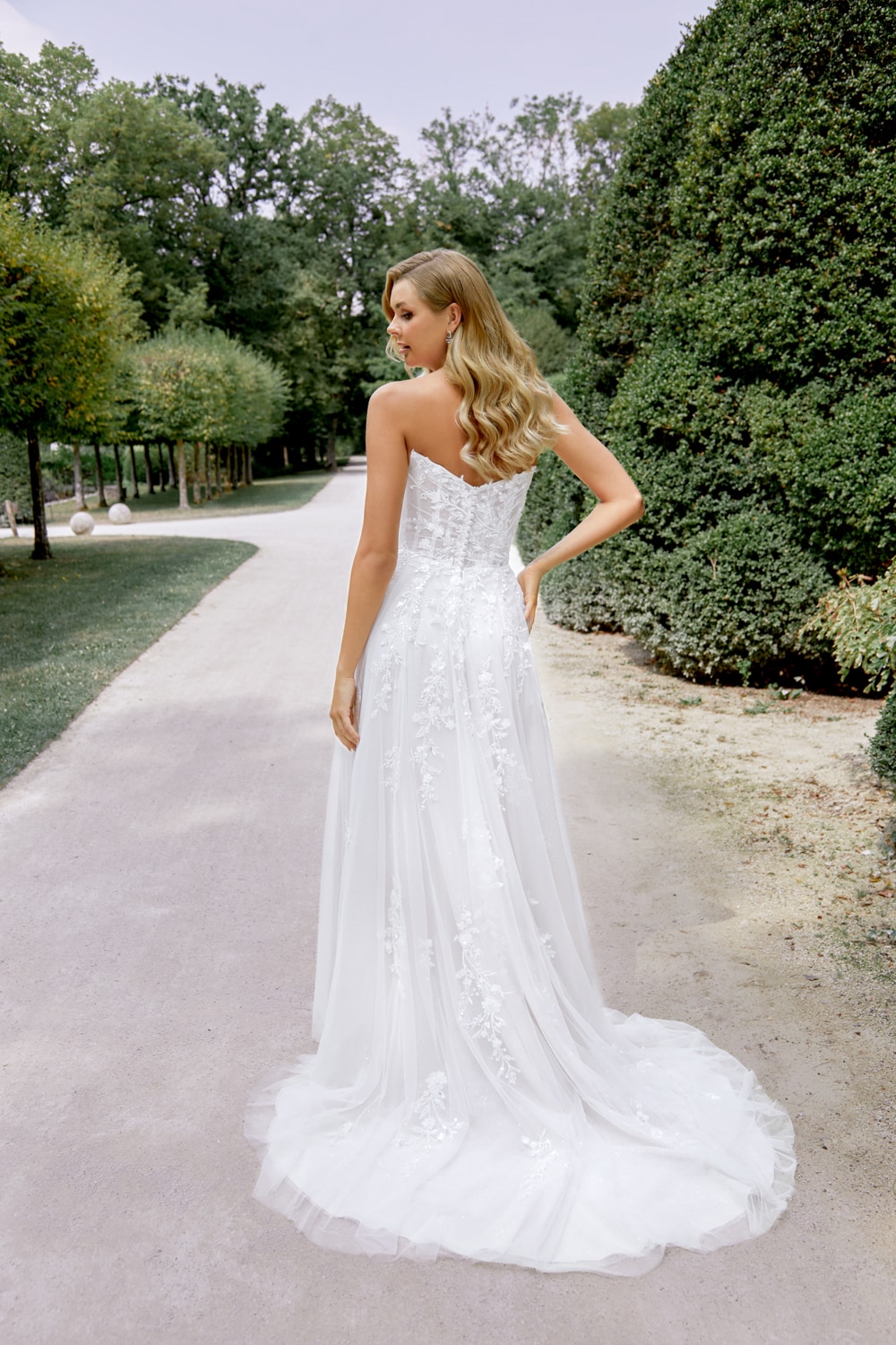 A-line wedding dress in “galaxy” tulle, with a sweetheart neckline and detachable off-shoulder cuffs. The bodice and back, slightly sheer, are embellished with 3D flowers and lace appliques with silver sequins that flow from the waist down to the end of the chapel-length train. The dress is finished with buttons on the back and a sexy slit on the skirt.