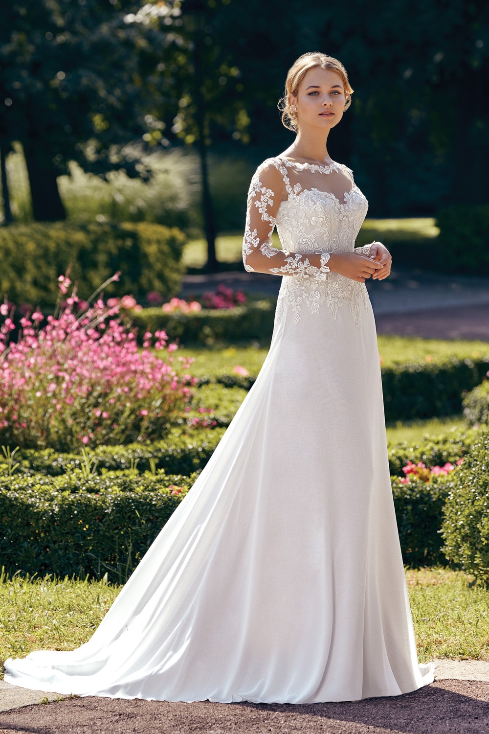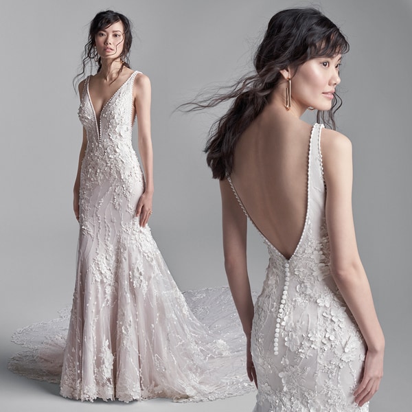 Per le spose con il fisico a pera perché mettono in risalto le spalle minute e la vita stretta. Il focus sul punto vita valorizza anche il body shape rettangolare, conferendo armonia alla figura. Questi abiti scivolati sono adatti anche per le spose curvy, le gonne leggere e poco voluminose non segnano e slanciano la linea.