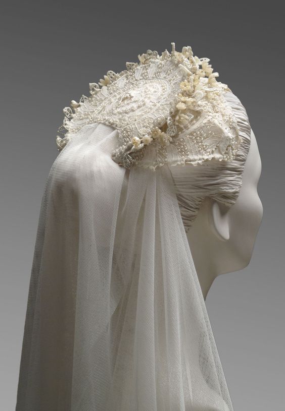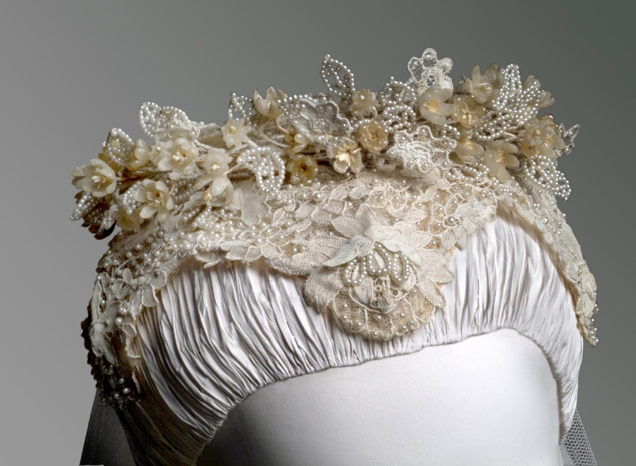 Sul capo della sposa un lunghissimo velo circolare con motivi di pizzo, fermato da una calottina in pizzo e perline e da una preziosa tiara. I motivi di pizzo applicati intorno ai bordi includevano due piccolissimi piccioncini.