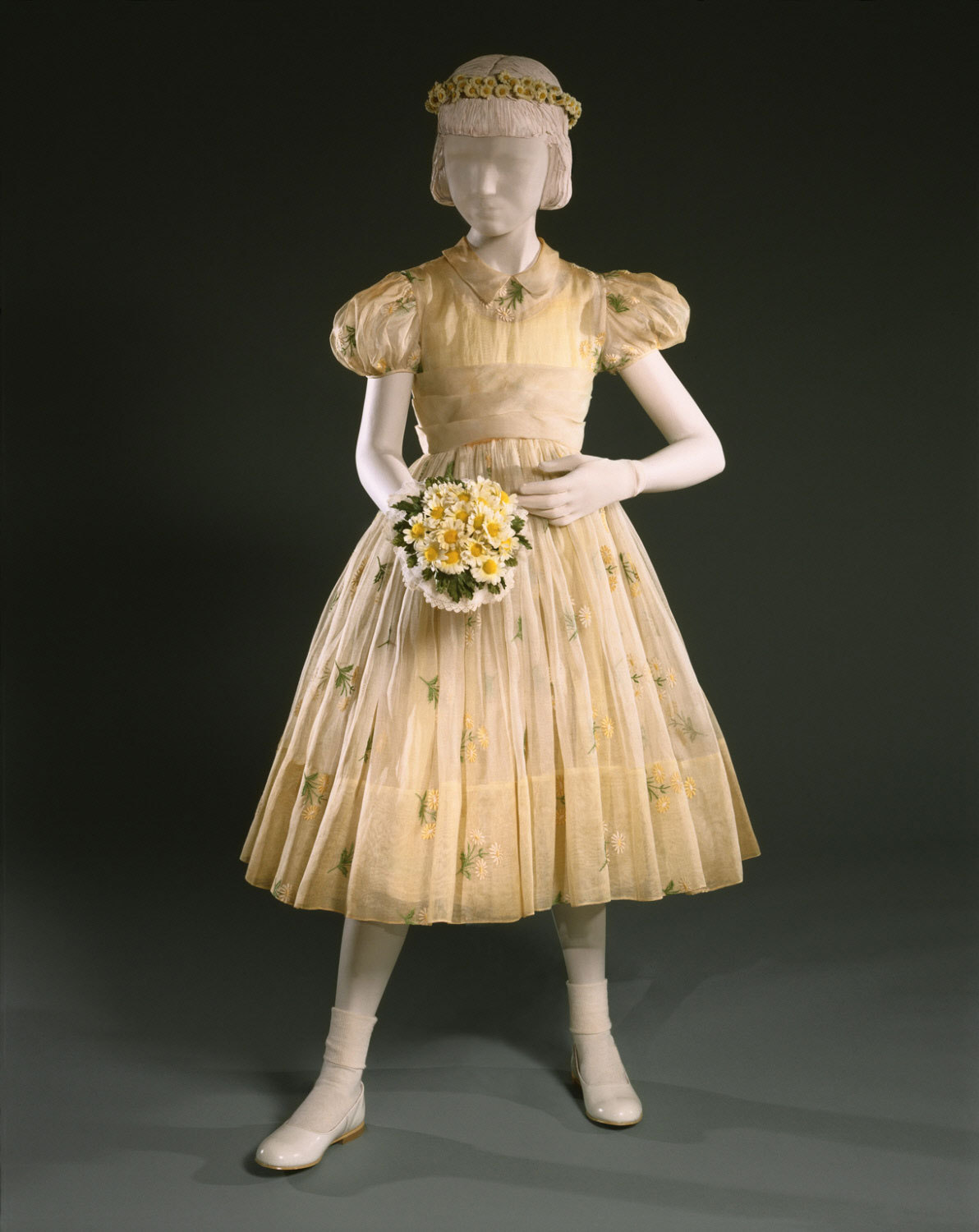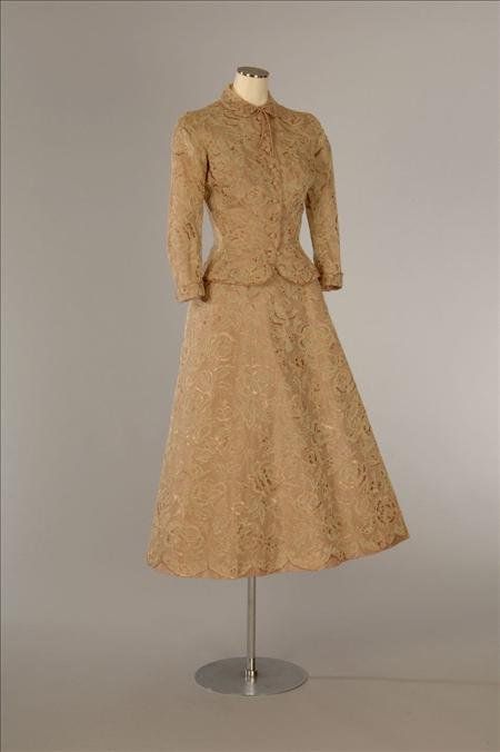 Anche l'abito a collo alto, a maniche lunghe, con una gonna lunga e svolazzante (e uno strascico lungo 10 metri e mezzo), è stato disegnato da Helen Rose-che aveva già disegnato il primo abito da sposa di Elizabeth Taylor quando sposò Conrad "Nicky" Hilton, così come l'abito di tendenza di Taylor in Father of the Bride.
