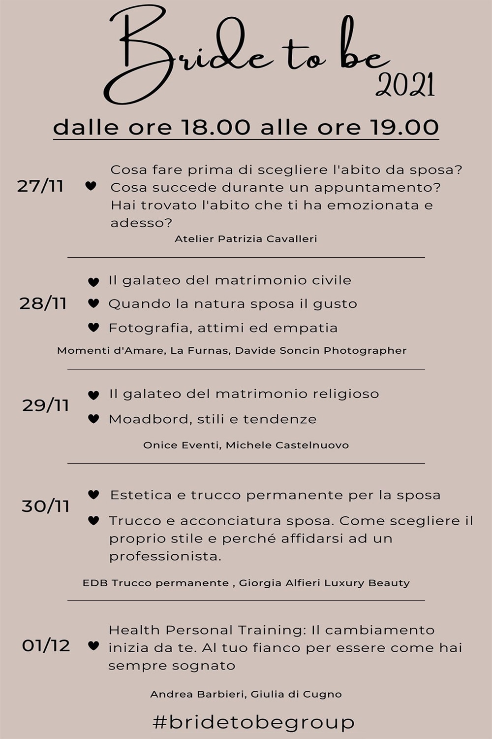Leggi il programma dei nostri webinar gratuiti per scoprire come organizzare il tuo matrimonio in modo impeccabile.