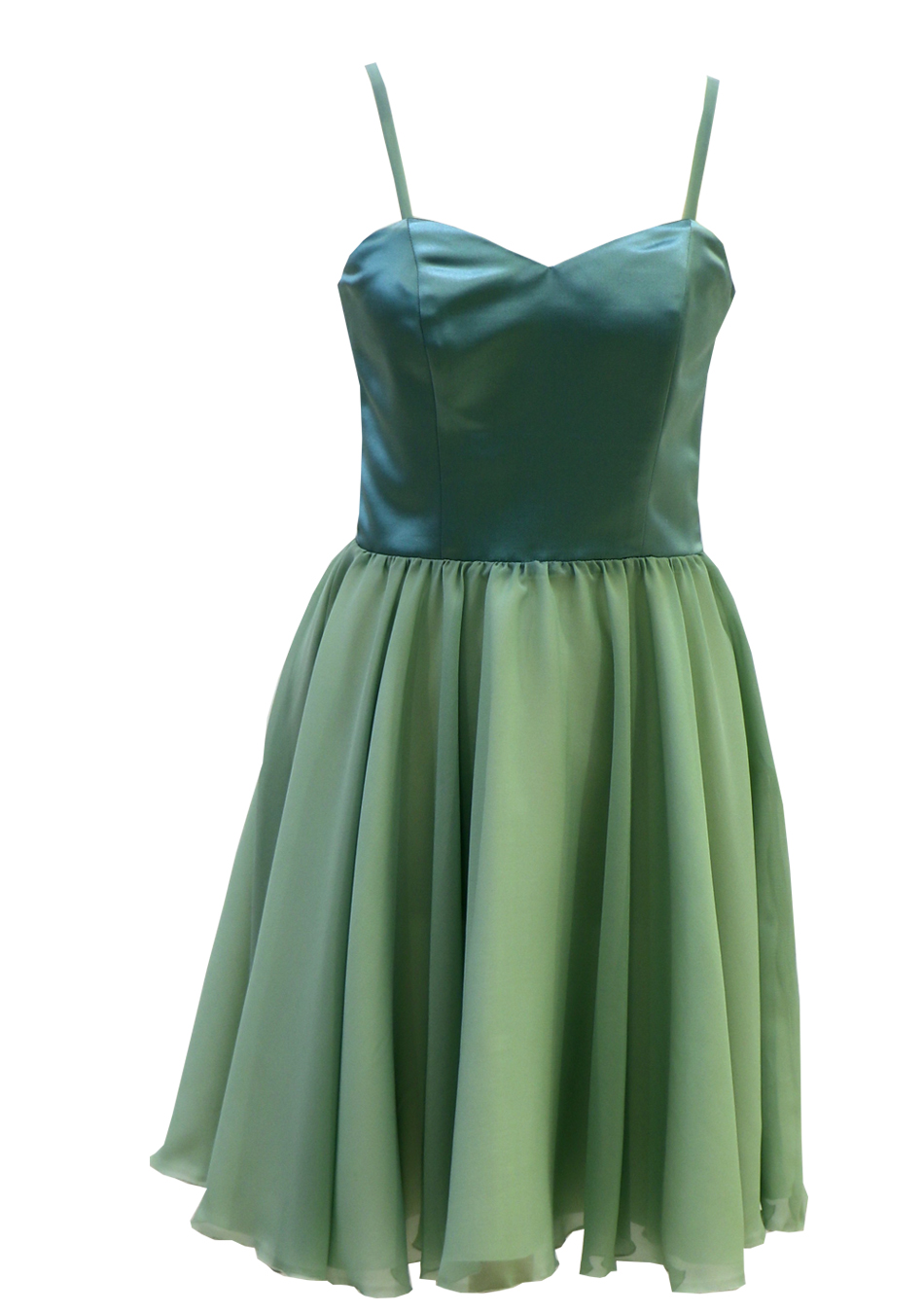 L'abito di Patrizia Cavalleri è realizzato in raso di seta con uno scollo a cuore e gonna ampia in chiffon. Nella parte alta l’abito è impreziosito da un giacchino in pizzo con maniche a 3/4. Il colore dell’abito è un verde stagno….ma potete richiederlo in altre tinte.