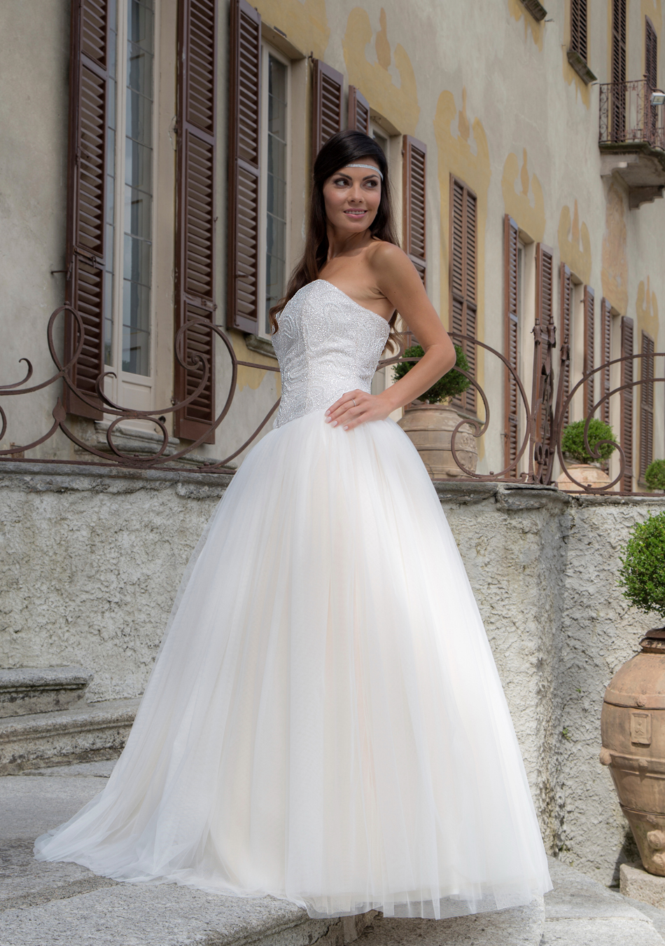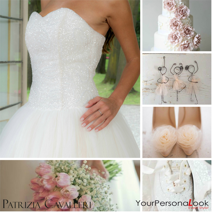 Dal momento che l’abito è composto da un’ampia gonna in tulle bianco, con sottogonna colorata rosa antico, e un semplice corpetto illuminato da strass abbiamo costruito la nostra proposta considerando come elementi tipici il tulle, sia bianco che rosa, qualche luccichio…ma senza esagerare e le forme ampie.