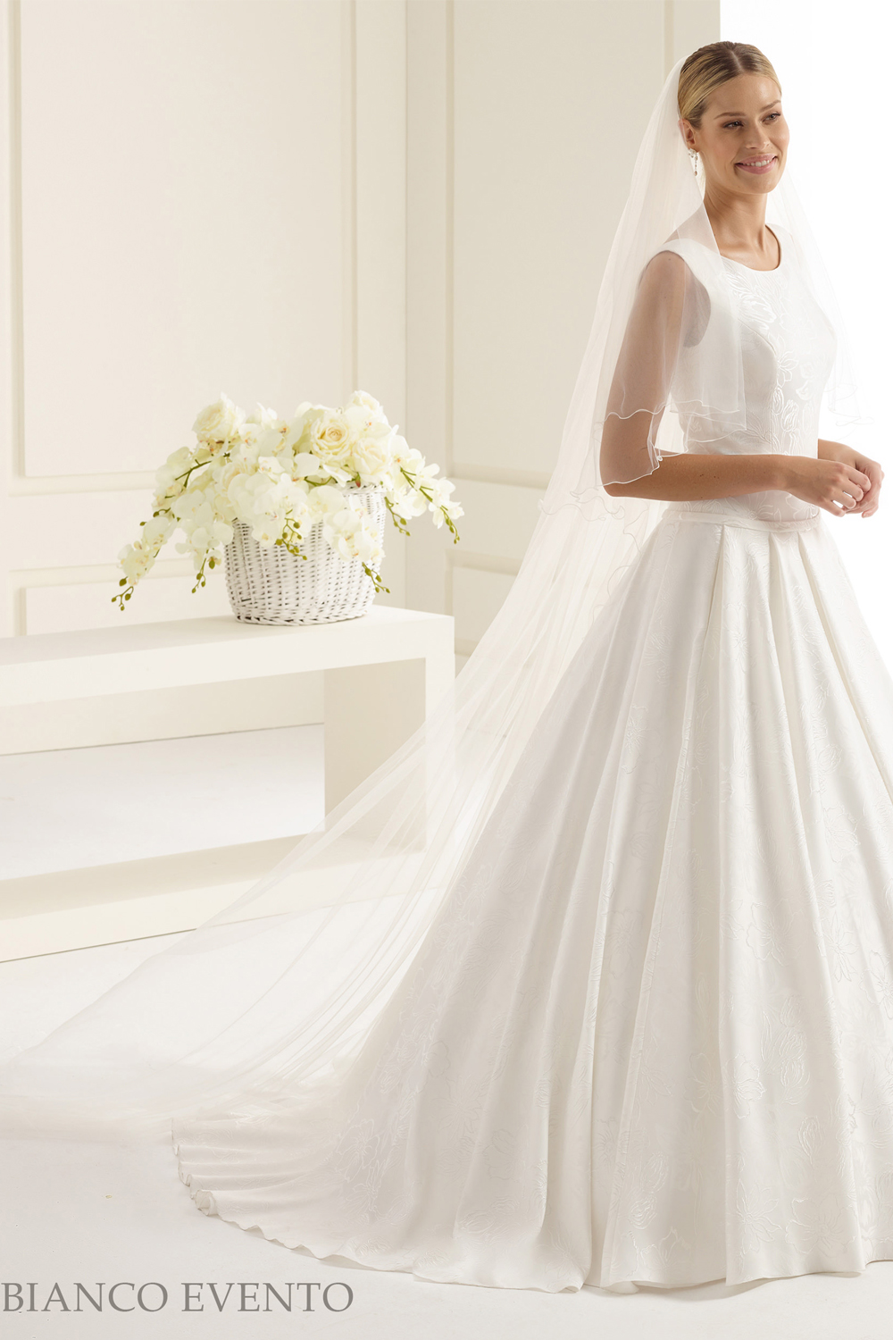 Per completare il tuo look ci starebbe molto bene un velo da sposa lungo che appoggia sulla coda dell'abito senza appesantirlo, questo per esempio, è davvero perfetto perchè ha un piccolo bordino ondulato che lo rende davvero particolare.