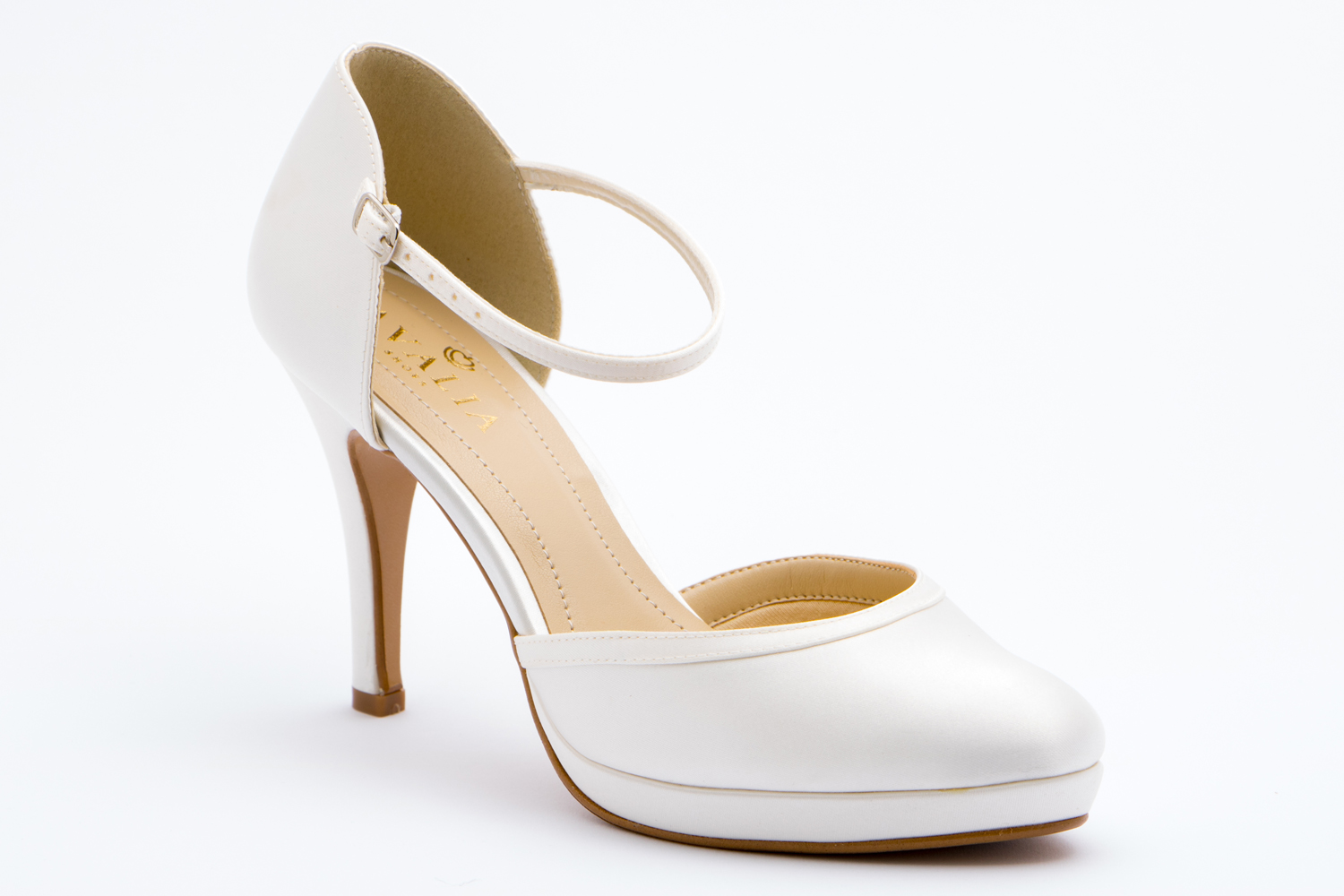 Non possono mancare la scarpe abbinate, la mia proposta per te è questo paio di scarpe da sposa in raso, tacco cm 9,5, plateau e laccetto alla caviglia.
