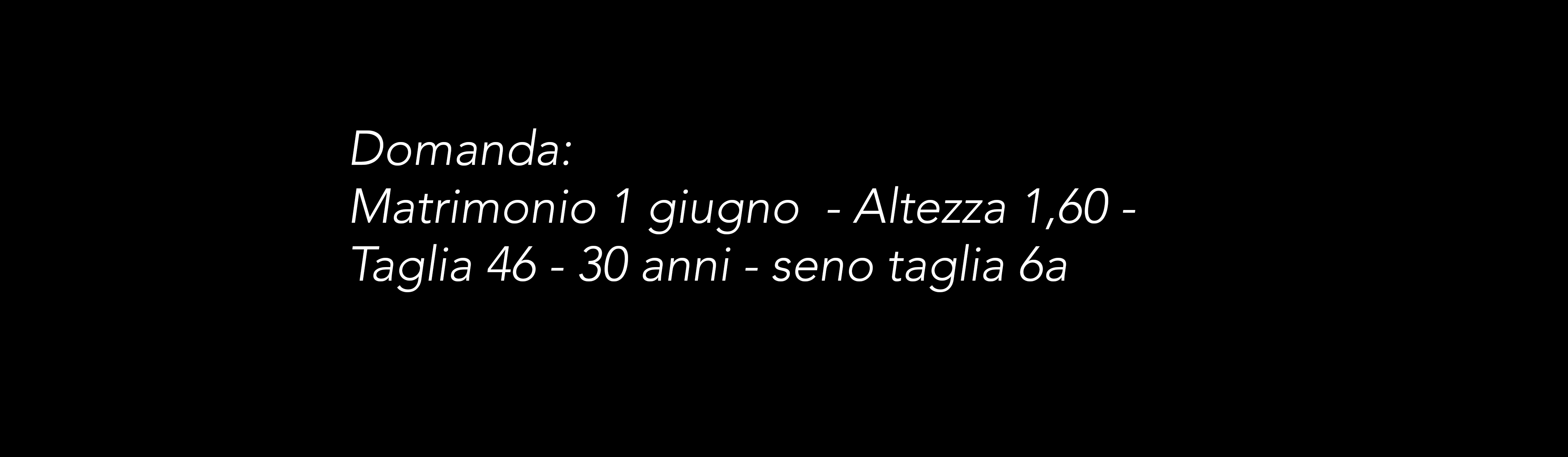 Il mio consiglio parte dando piu' importanza alla misura del tuo seno che va vestito adeguatamente perchè ti senta a tuo agio. La data del tuo matrimonio, 1 giugno, ti consente anche di indossare una manica a 3/4 in modo da poter evitare coprispalle separati. Sicuramente l'abito ti vestirà largo in vita e un po' anche sui fianchi ma le sarte potranno stringerlo a misura in modo che ti sia perfetto. Ti dico questo perchè per ordinare la taglia giusta per il tuo seno le altre misure saranno sicuramente abbondanti. La bellezza di questo modello è anche nel pizzo con cui è realizzato, pizzo che è interamente  bordato con un sottile filo argentato e ricamato con jas argentati. La linea scivolta di questo vestito, senza taglia in vita, slancia anche la tua figura.