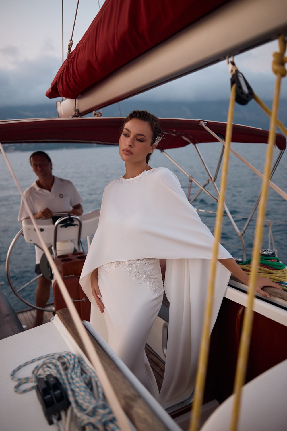 Completa il tutto una cappa in raso pesante con collo bordato in pizzo.