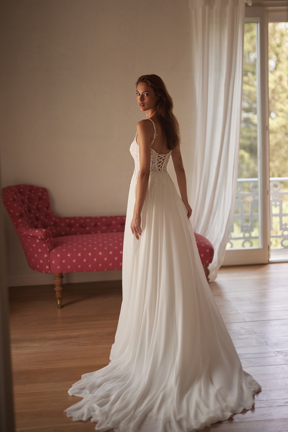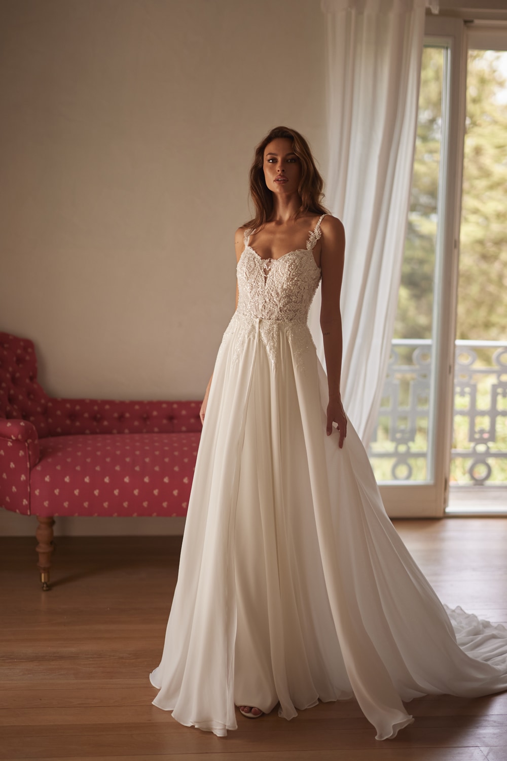 La sopragonna è in chiffon e dona leggerezza al vestito.