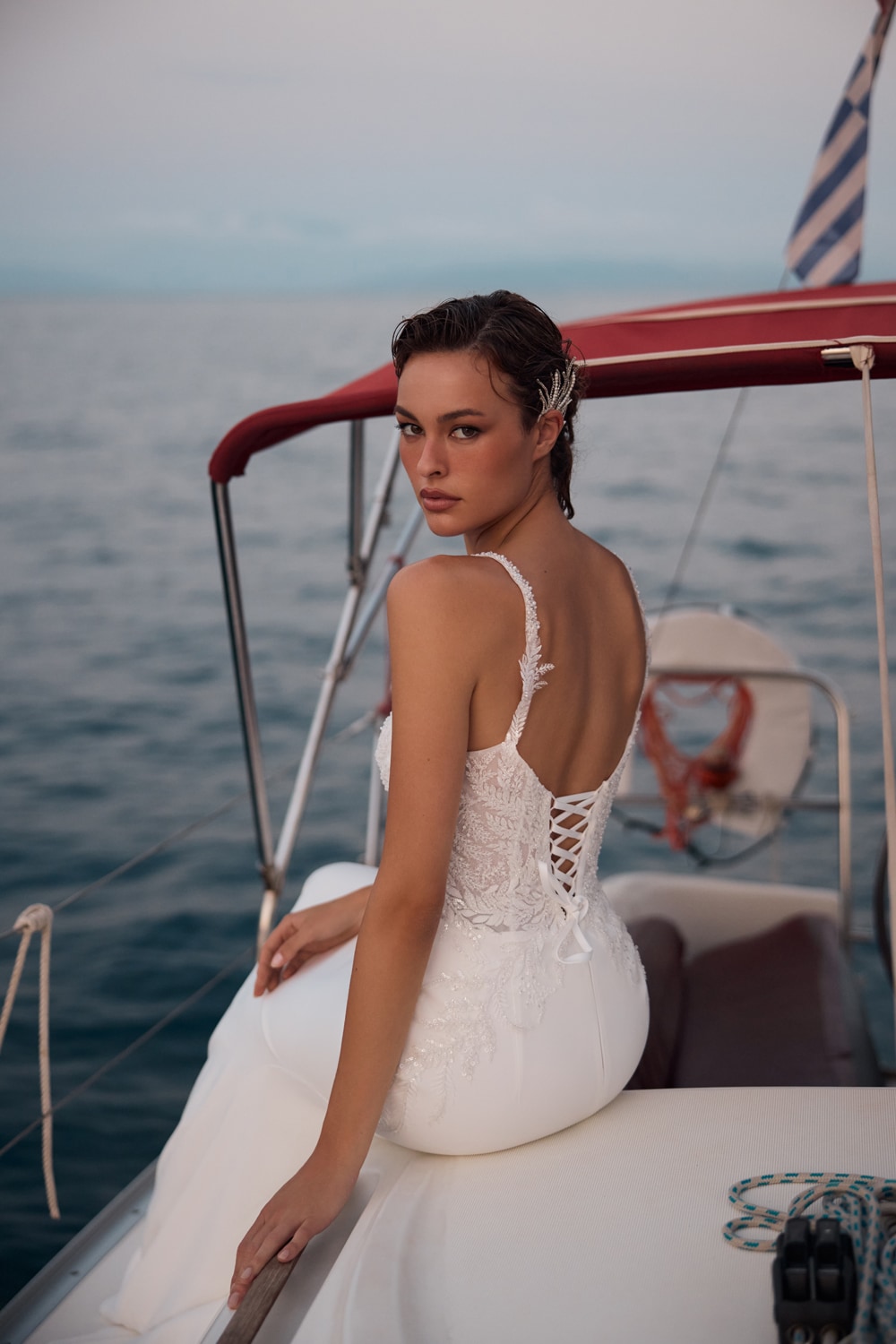 La parte più asciutta è formata da un corpetto in pizzo con corsetto stringato e gonna dritta in raso pesante.