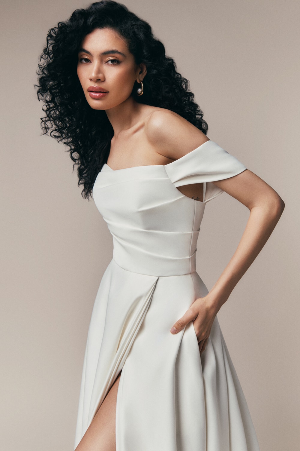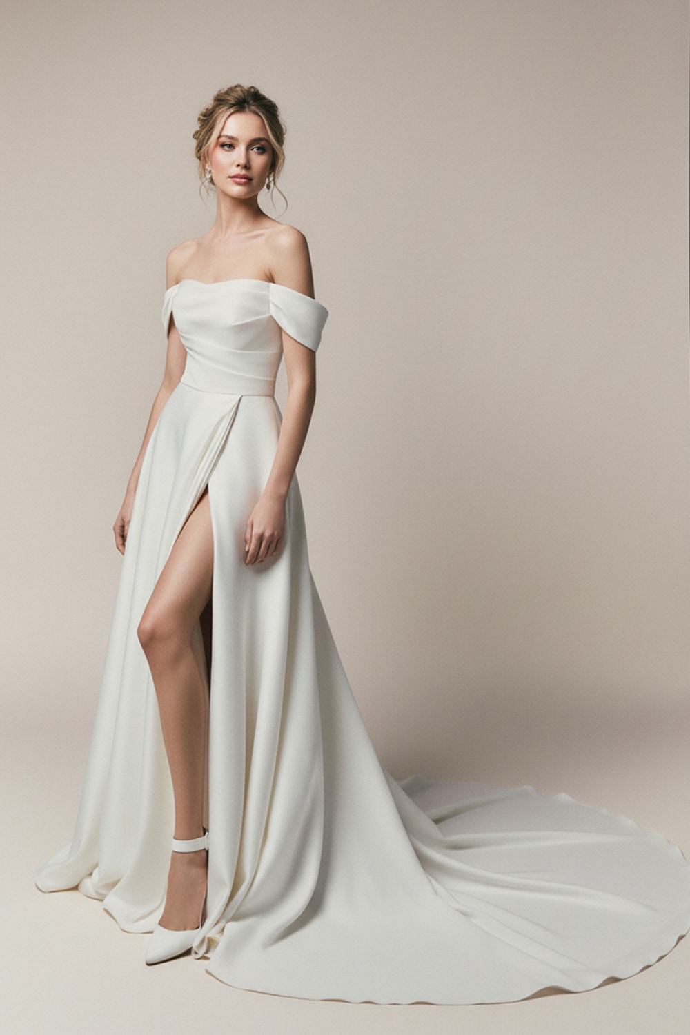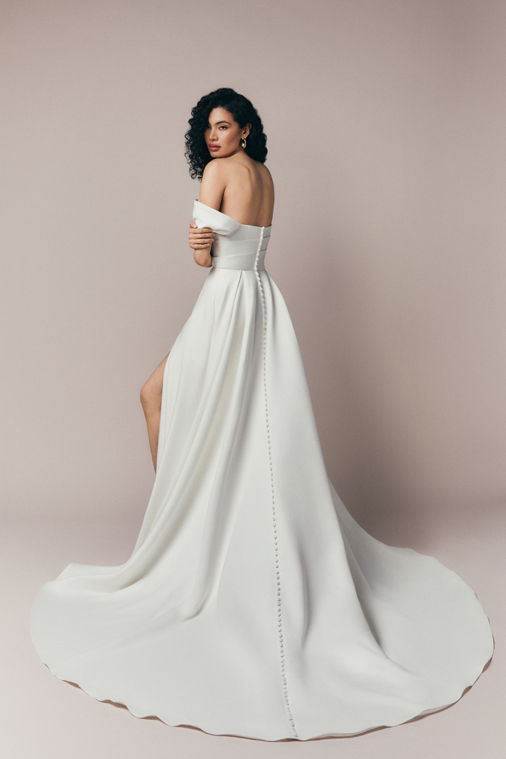 Abito da sposa linea ad A con corpetto drappeggiato, maniche staccabili, spacco e tasche, tutto quello che deve avere un abito da sposa per lasciare il segno.