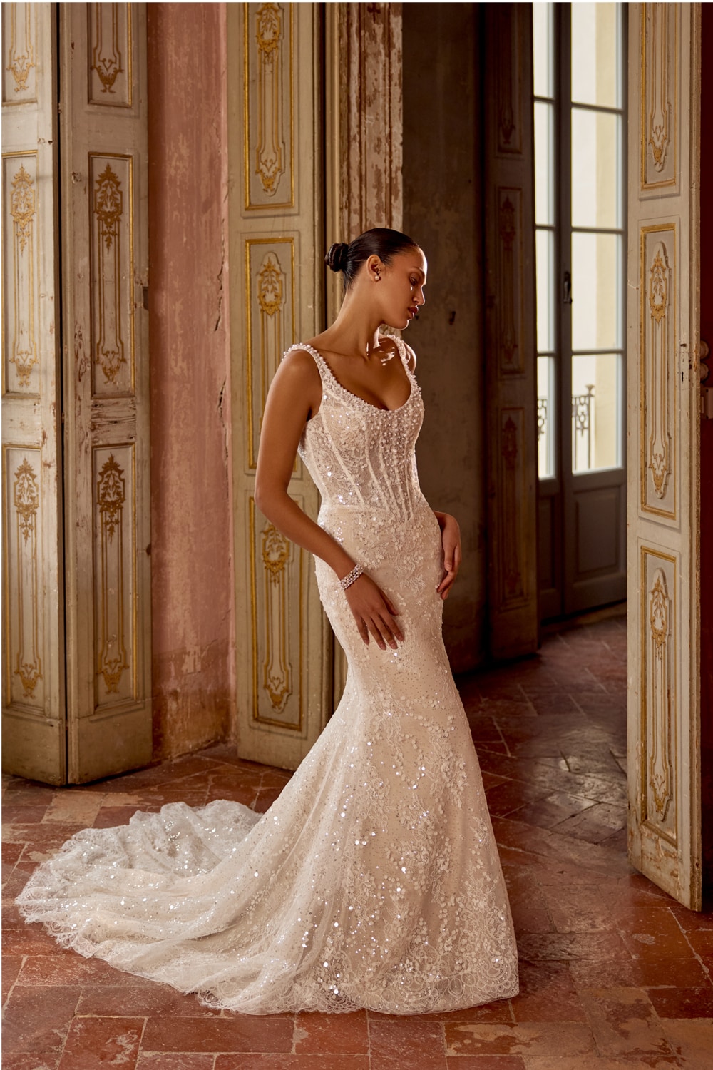 Abito da sposa fit and flare in pizzo Chantilly e paillettes, con scollo a U. Lo scollo è impreziosito da perle di diverse dimensioni, che scendono delicatamente sul corpetto in tulle illusion. Il corpetto, leggermente trasparente, lascia intravedere le stecche a vista e termina in un elegante punto vita a baschina.