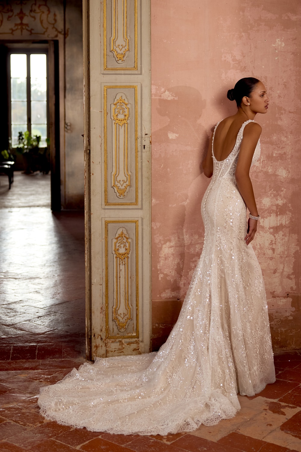 Paillettes tono su tono e paillettes argento si distribuiscono su corpetto e gonna creando un effetto luminoso uniforme. Sul retro, lo scollo a U è rifinito da bottoncini rivestiti in pizzo Chantilly che proseguono lungo lo strascico di lunghezza cappella.