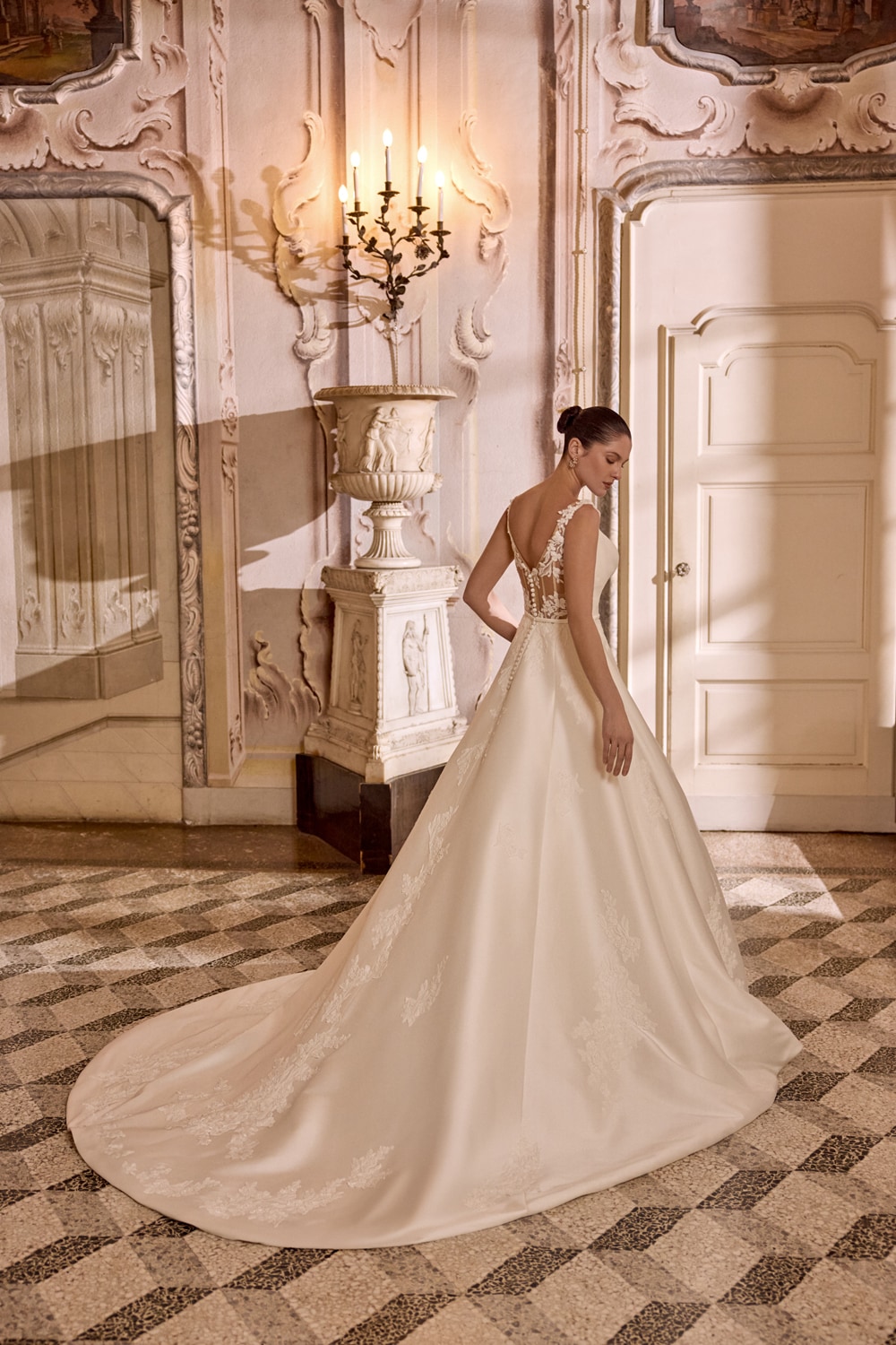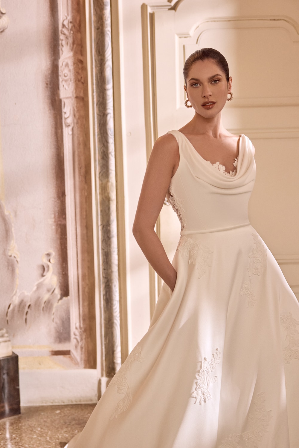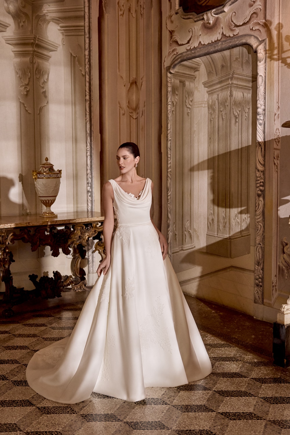Abito da sposa principesco in mikado con scollo a cappuccio e dettaglio “vedo-non-vedo” in pizzo ricamato con paillettes.