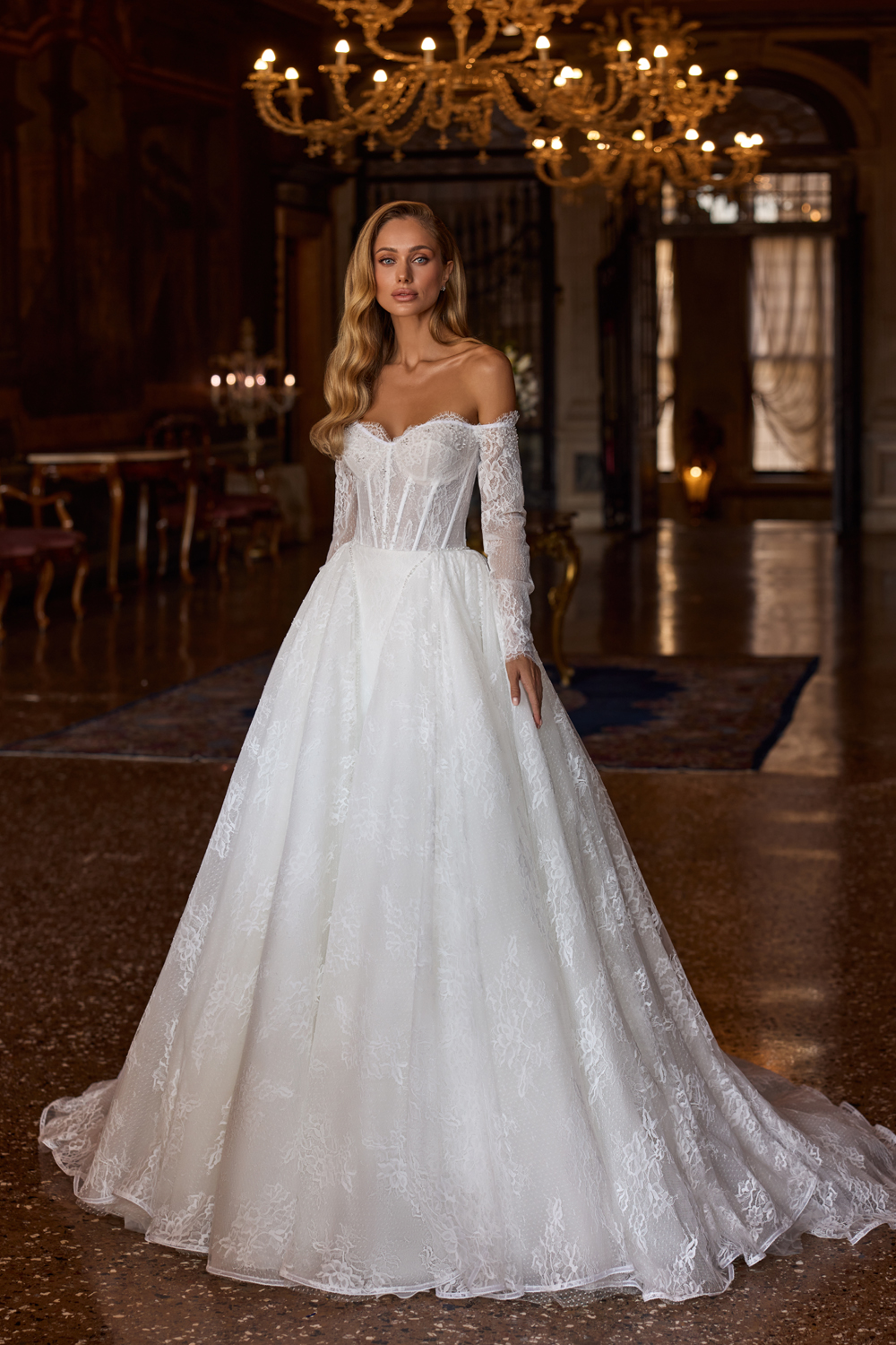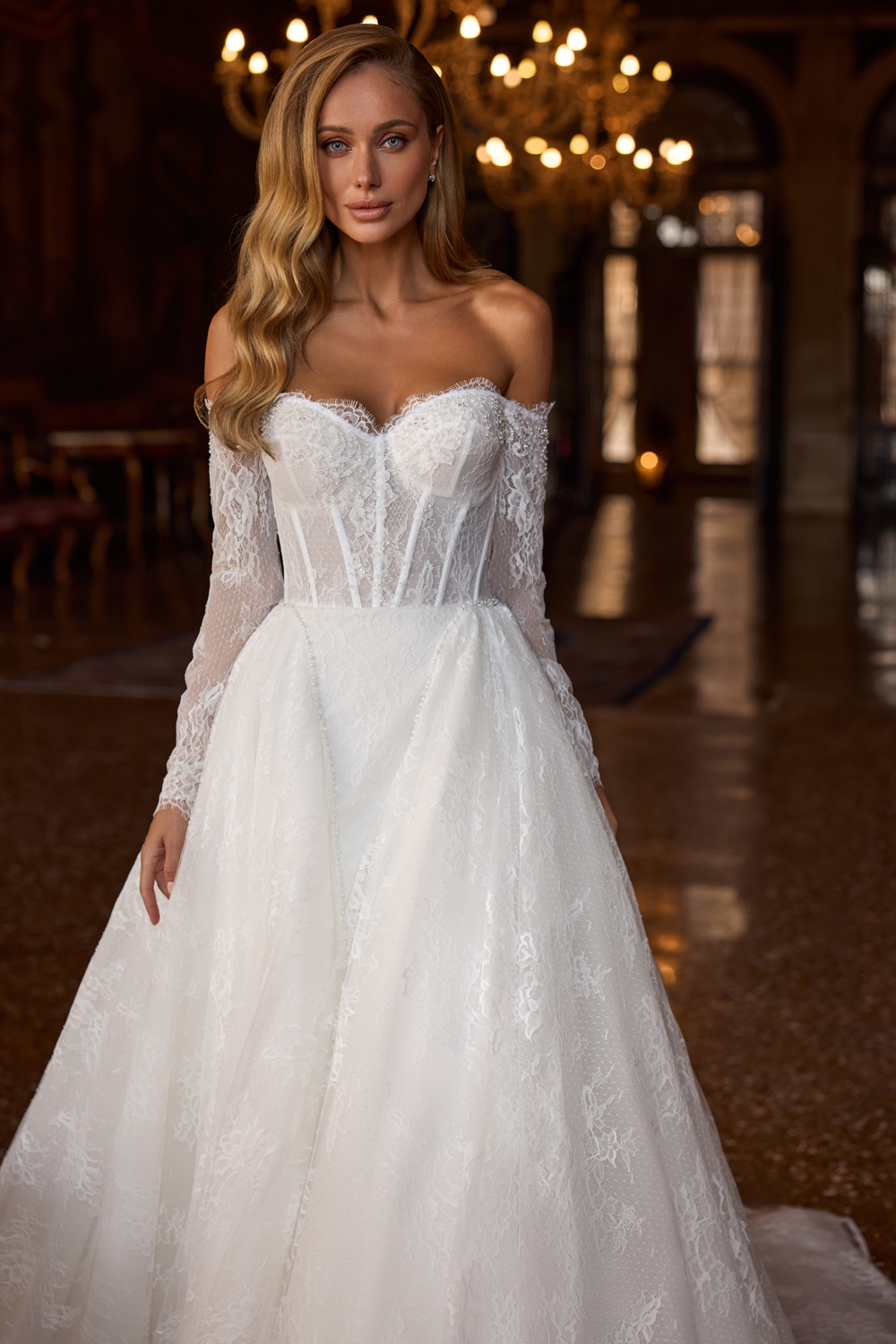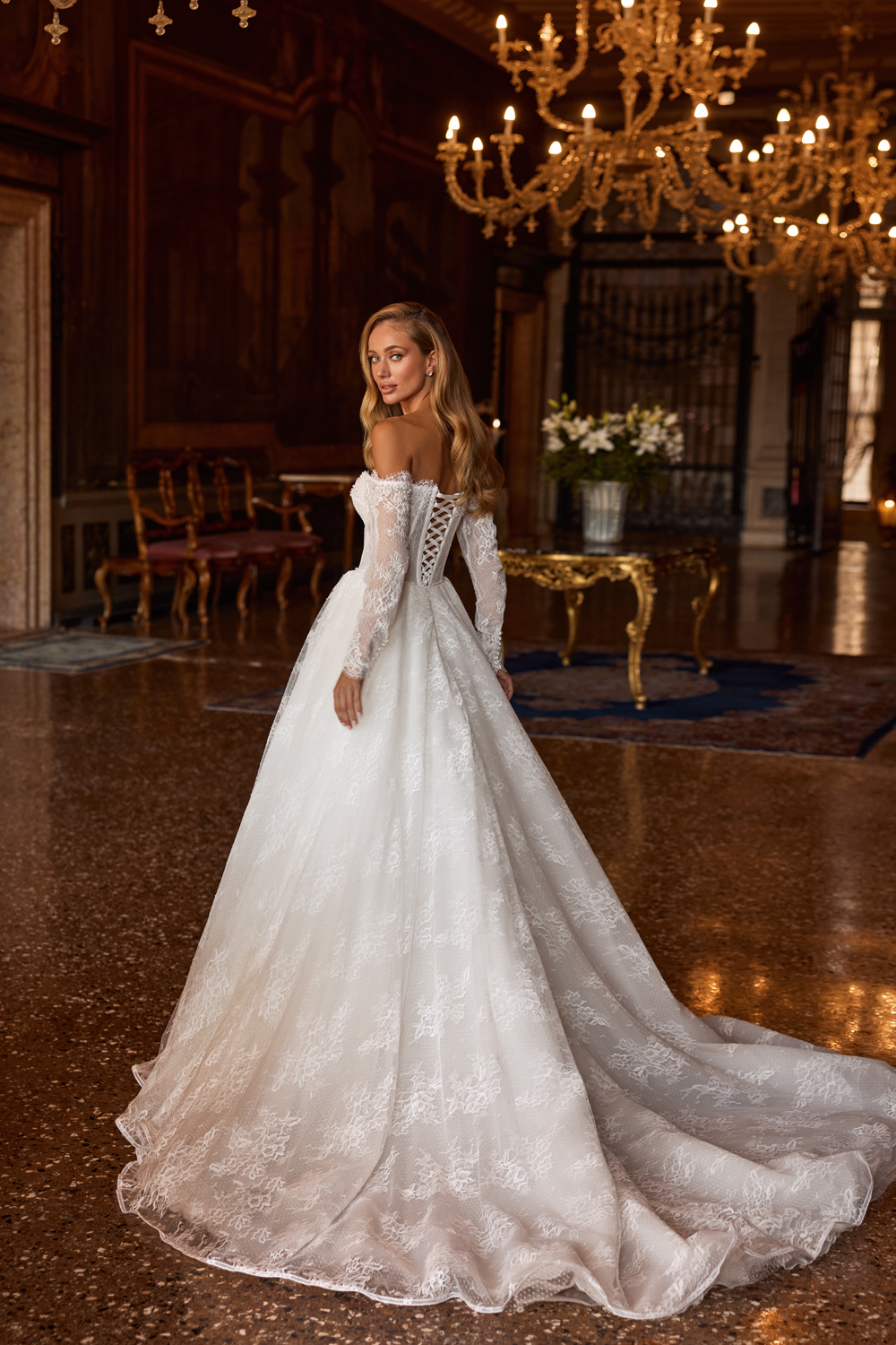 La linea ad A esalta la vita ed il pizzo chantilly lo rende un abito regale.
