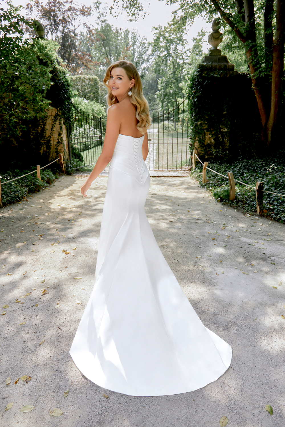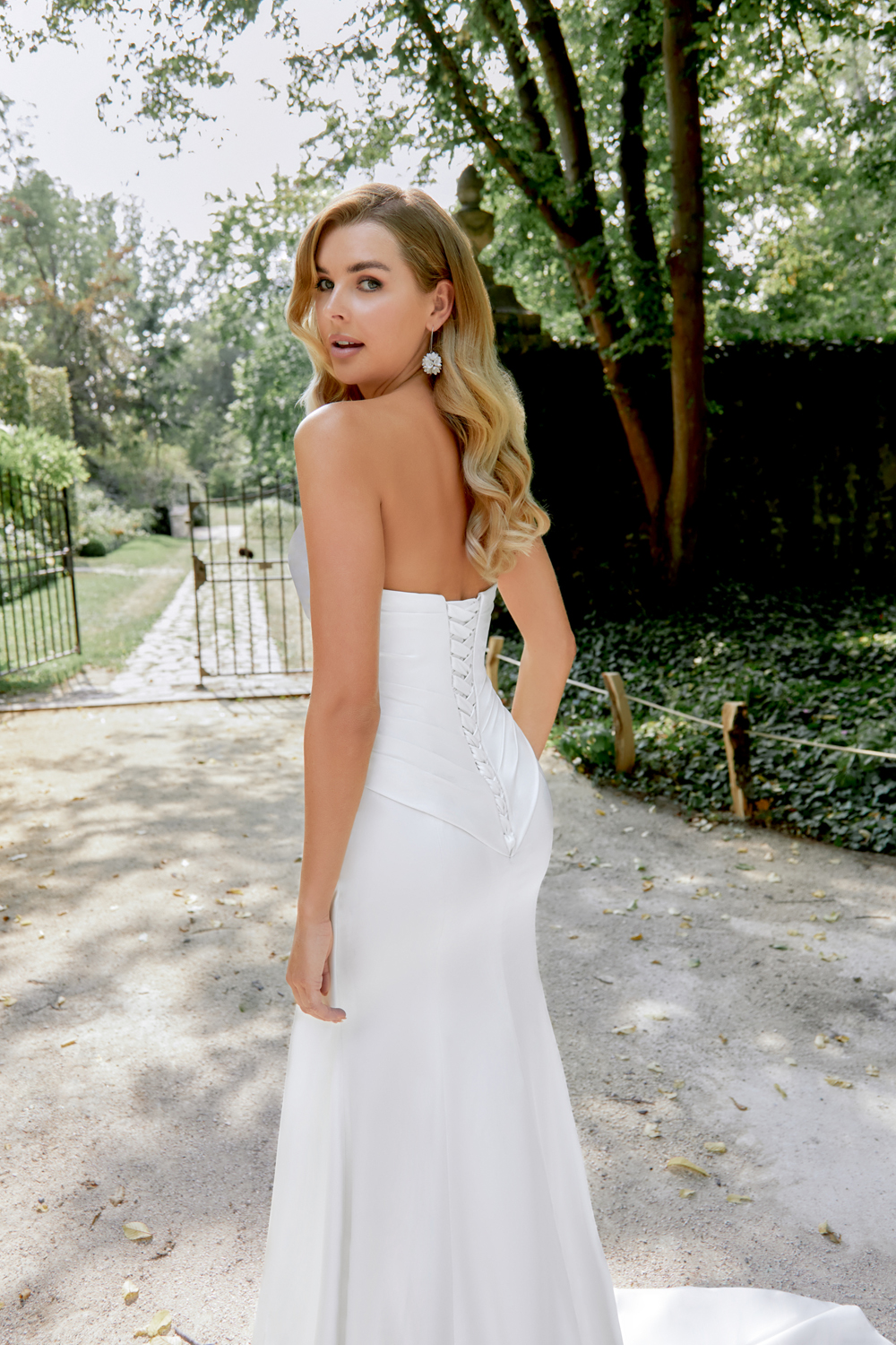 Una sirena dalle linee pulite ma con dettagli speciali, il drappeggio sul davanti nasconde la pancia, la scollatura a cuore delicato esalta le spalle, l'allacciatura a corsetto sulla schiena calamita gli occhi, e tocco essenziale, il raso stretch che ti consente di muoverti in libertà