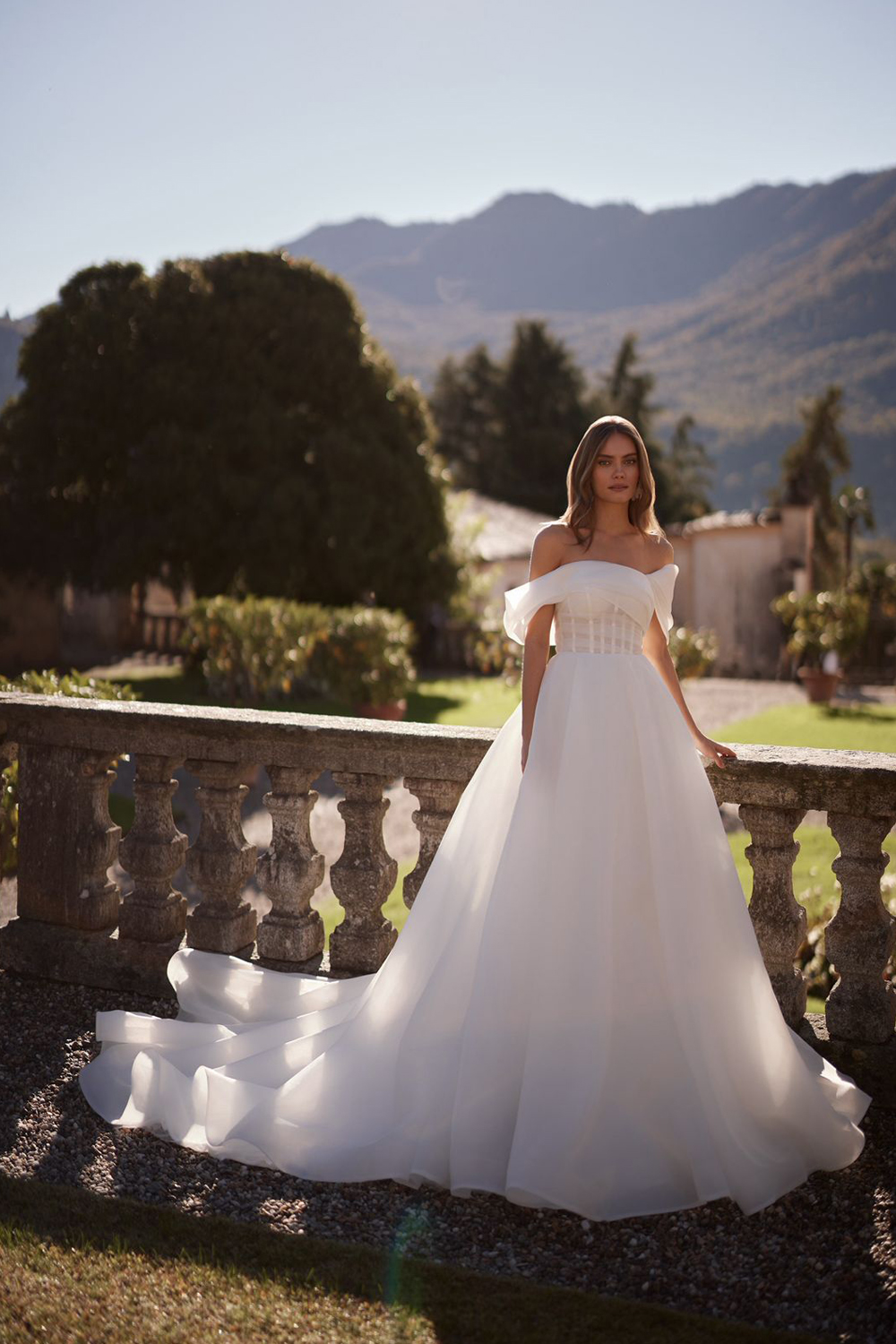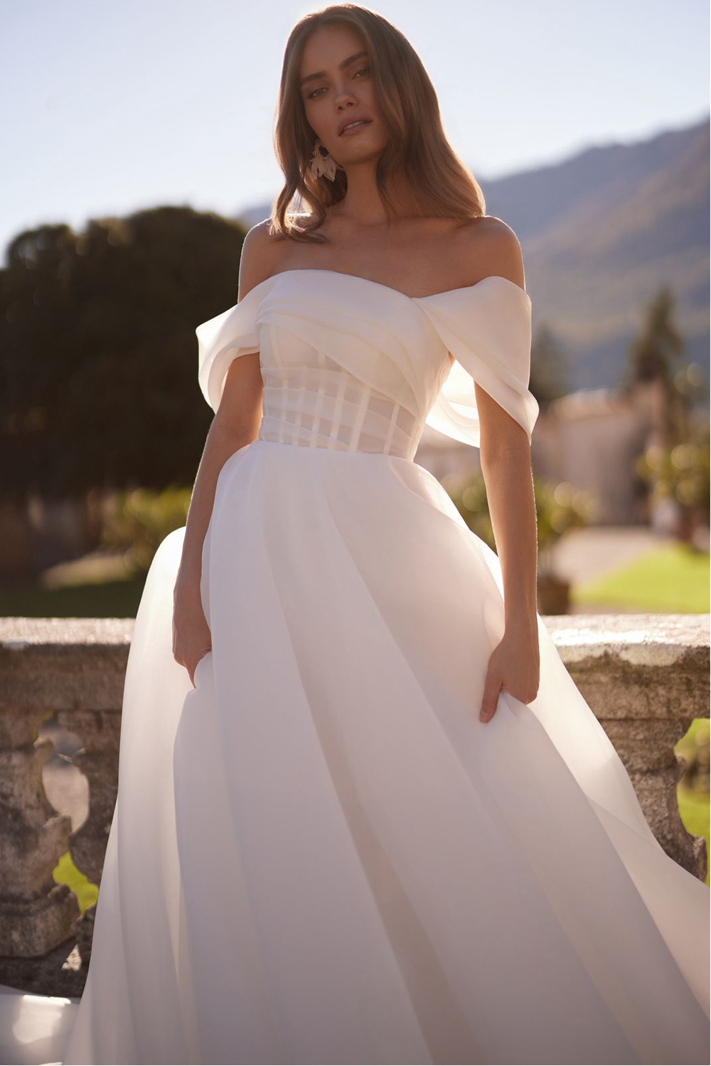 Poezia nasce dall'incontro tra rigore sartoriale e leggerezza pura. Il corpetto con stecche a vista dona struttura e definizione al busto, mentre le maniche off-shoulder in organza drappeggiata scivolano morbide sulle braccia con un gesto romantico e naturale — come un abbraccio appena accennato.