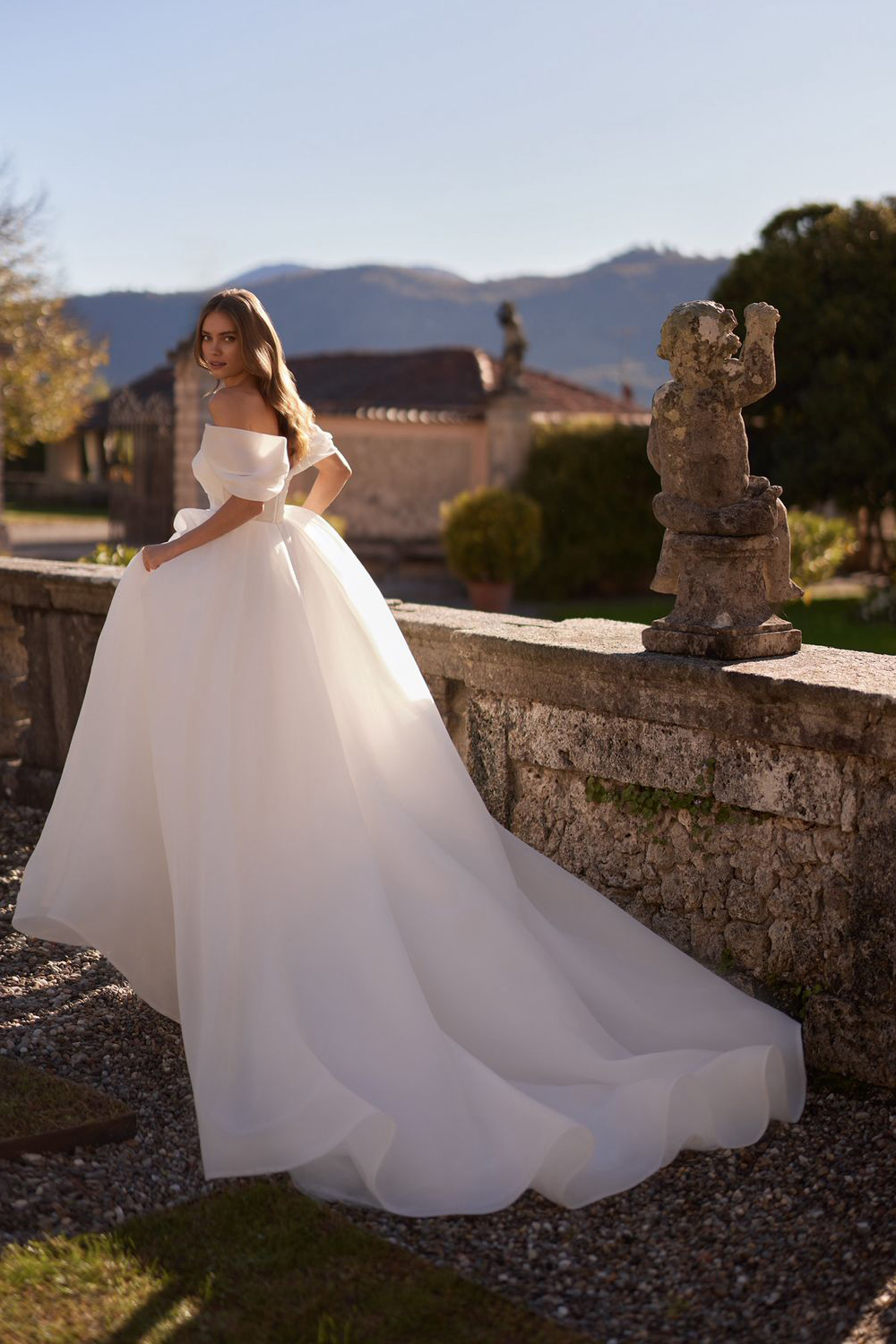 La gonna è pura poesia in movimento: strati di organza che si aprono in un volume principesco, amplificato da uno strascico generoso che cattura la luce e si muove come una nuvola.