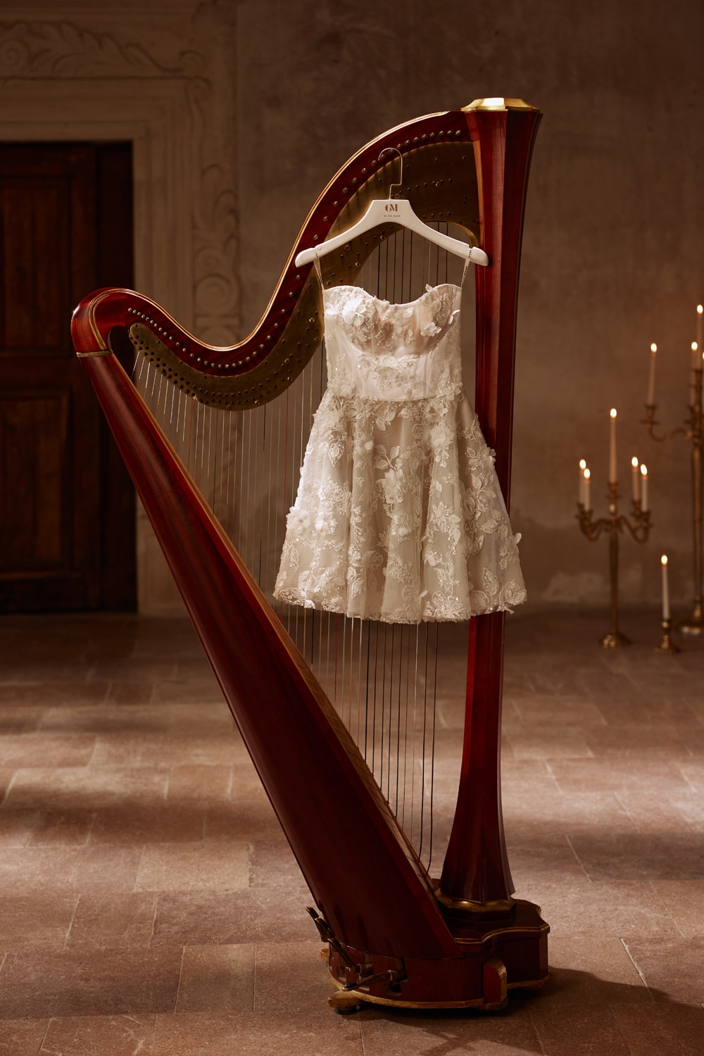 Il cambio d'abito perfetto, un abito con gonna leggermente a ruota, corpetto con scollo a sorriso e stecche a vista, pizzo in 3D.