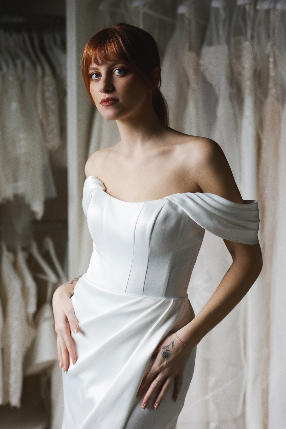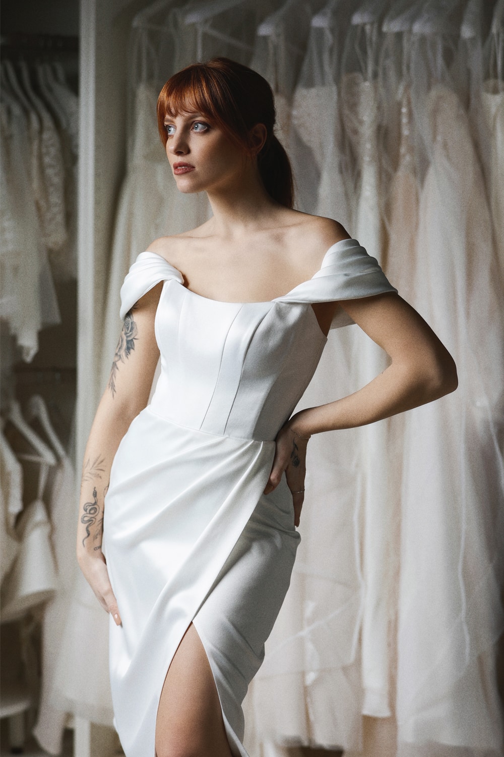 Abito corto in raso con drappeggi sulla gonna davanti e spacco. Il corpetto è stringato sulla schiena e le spalline scese sono rimovibili.