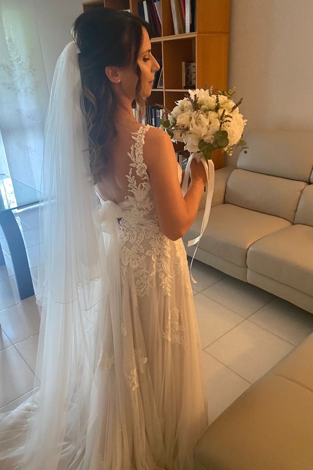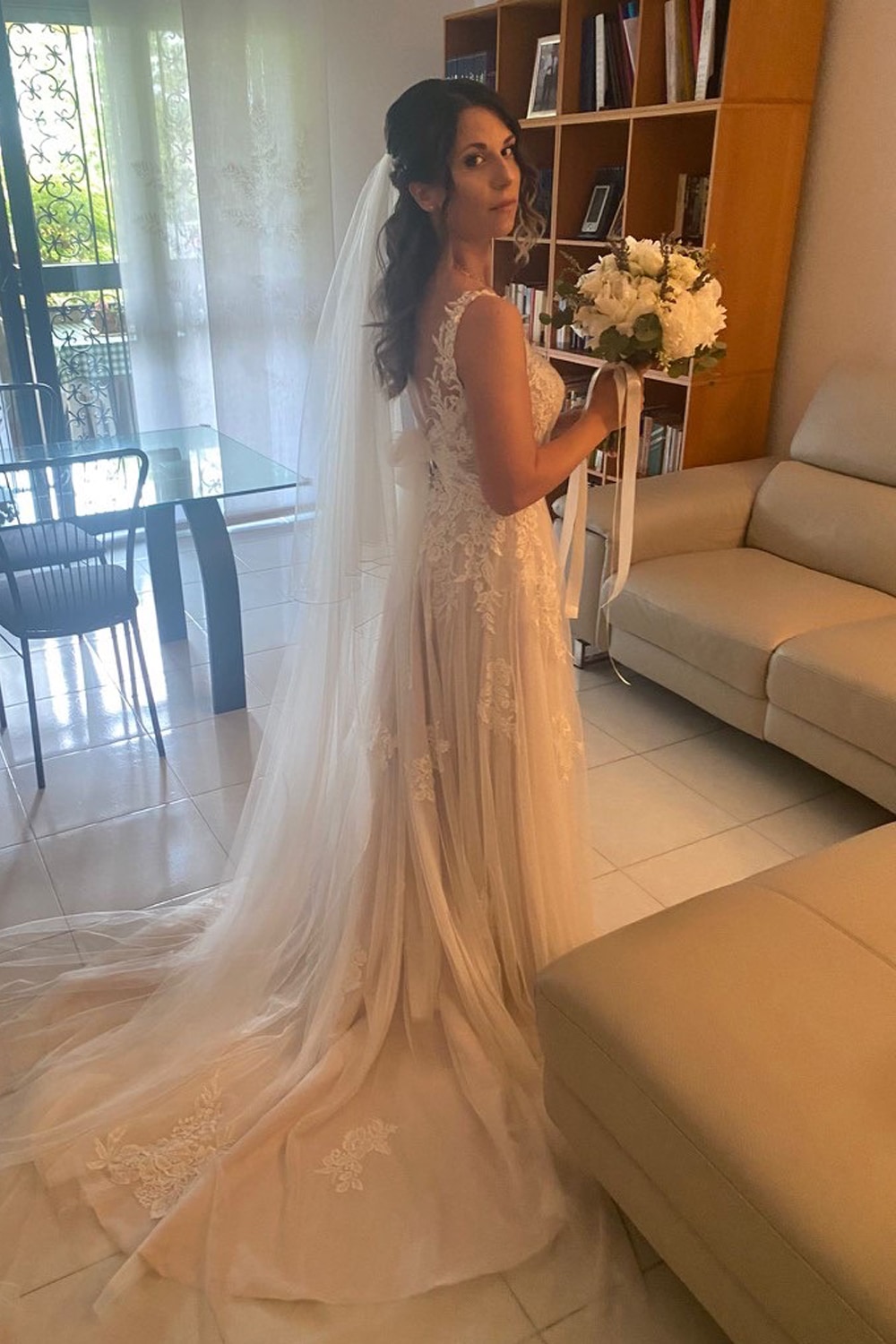 Ricordo benissimo quel giorno quando, scorrendo i post, vidi l’immagine di questo bellissimo vestito che, indossato alla modella, era stupendo, perfetto, quello che cercavo! Ero già stata in un altro atelier per la prova, ma senza trovare il vestito giusto.