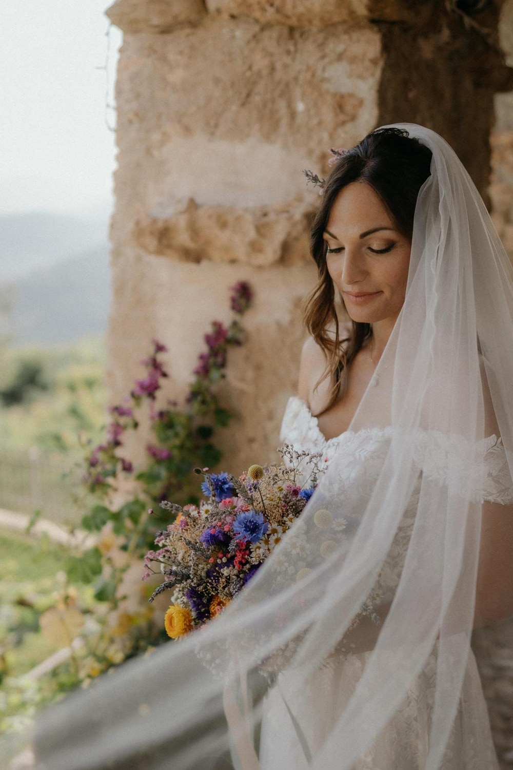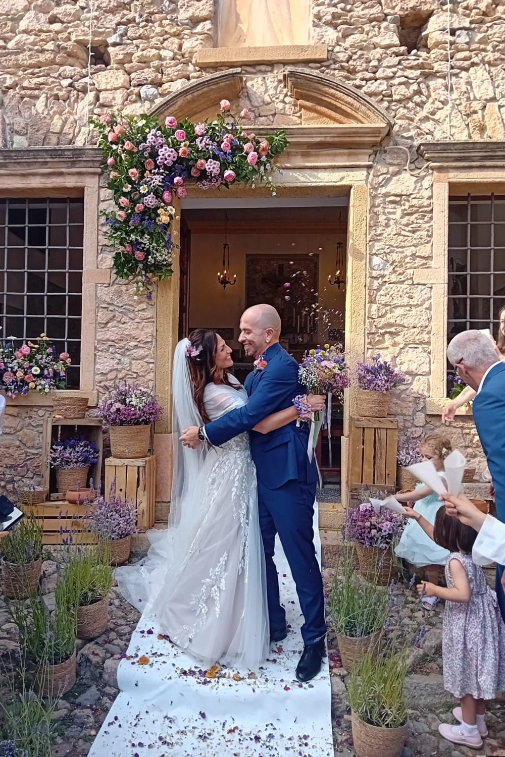 Da Patrizia ho preso anche il bolerino, il velo e le scarpe. Tutto era perfetto, in particolare le scarpe molto comode, ho potuto tenere il tacco tutto il giorno senza problemi. Molto utili anche i consigli ricevuti nell’ultima prova (come sedersi, come camminare verso l’altare…) e sul tenere conto del colore dell’abito per la scelta dei fiori.