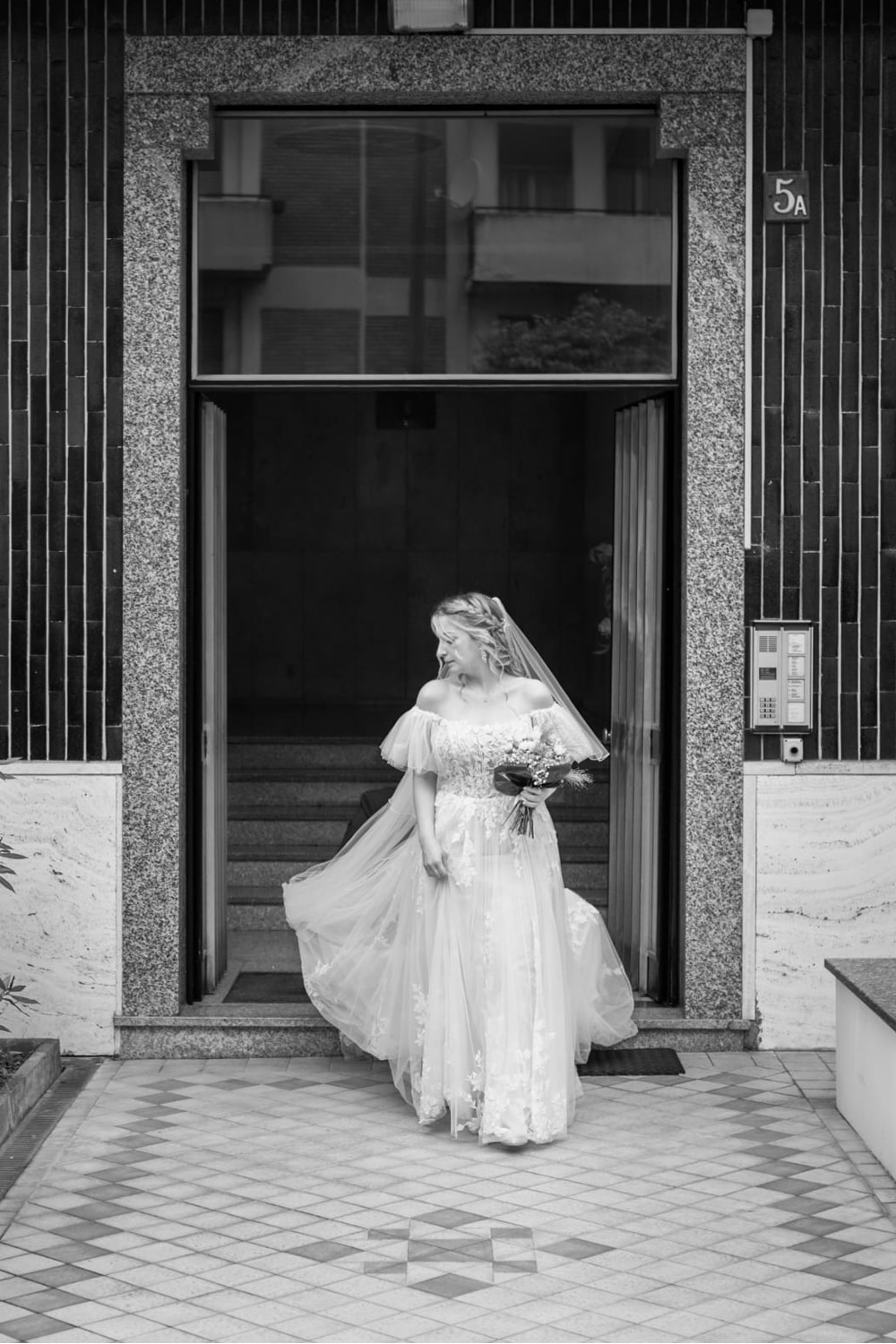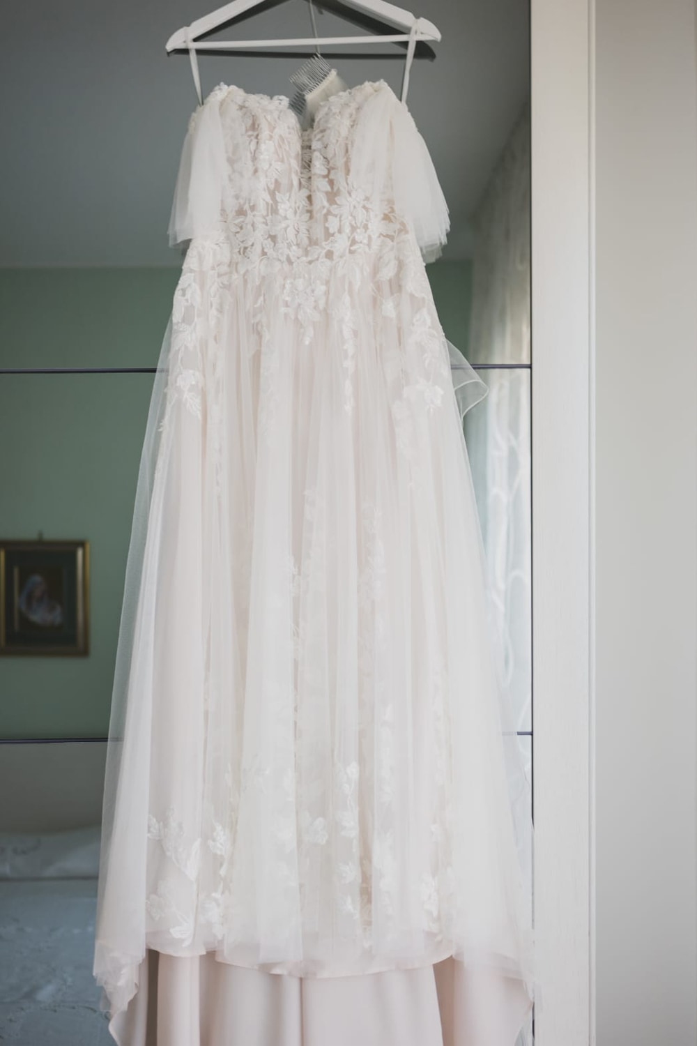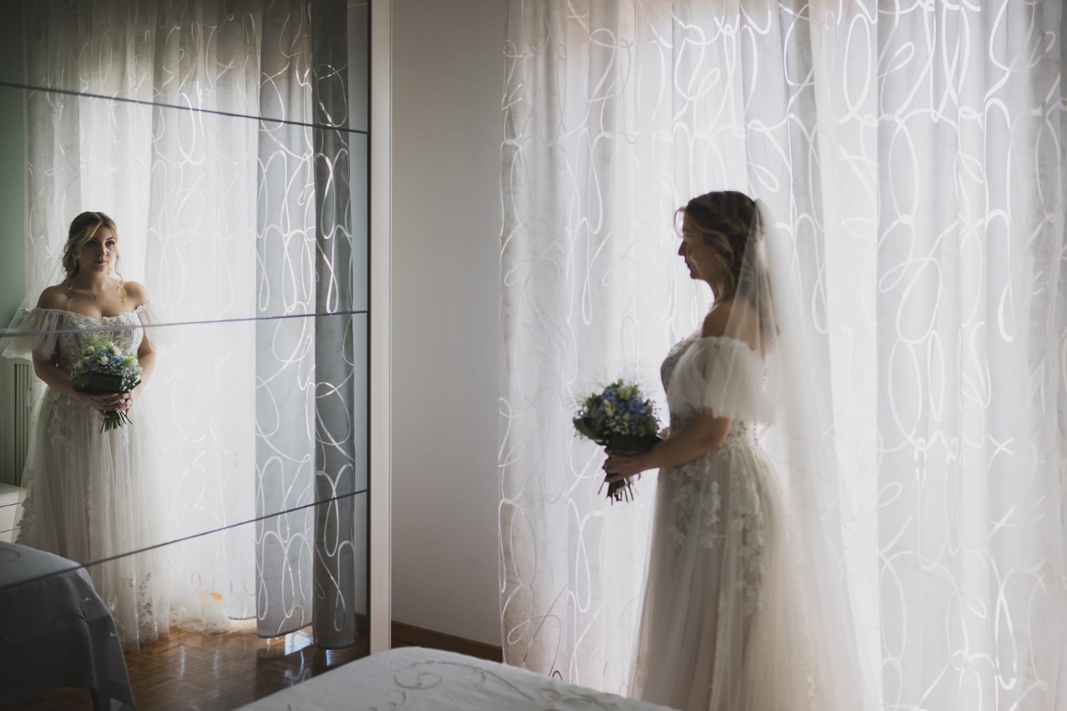 La prima volta in atelier ero molto agitata, avevo la fissazione che non avrei trovato il mio abito e il pensiero mi rattristiva anche perché ci tenevo molto a trovarlo lì da lei. Arrivata avevo in camerino 4 abiti che mi attendevano, infilato il primo e uscita dal camerino abbiamo iniziato a capire cosa mi piacesse e cosa non mi piacesse dell’abito e così per tutti i successivi. In realtà, infilato il secondo abito, mi sono commossa immediatamente guardandomi allo specchio.